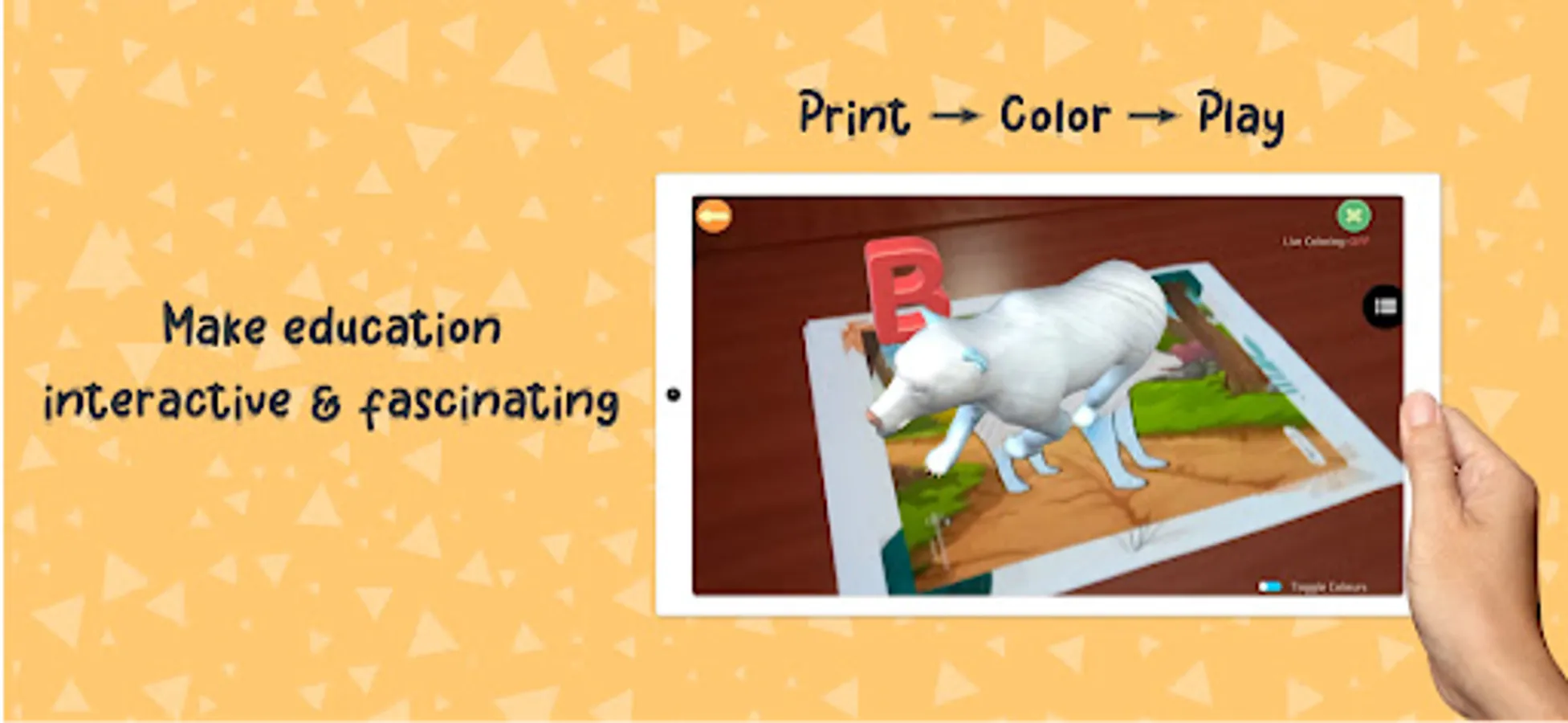 Colour characters, animals, objects & bring them to life on your mobile phone, PC and connected TVs & Projectors. See them animated on the screen and hear the lesson to learn about them.