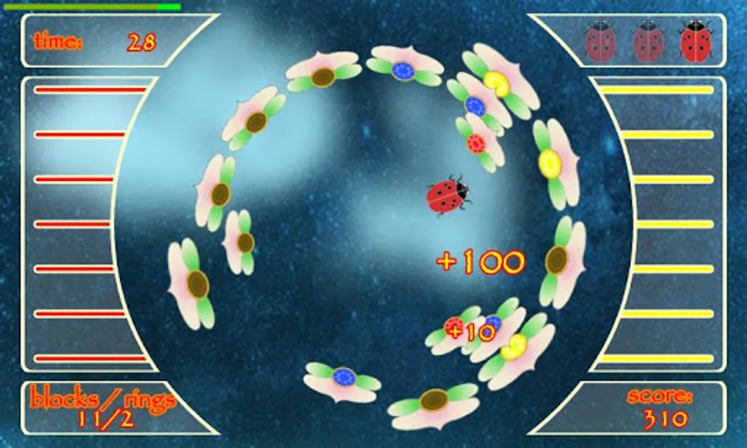The goal is to keep the ladybug in the playing field, rotating the rings of flowers with your fingers to bounce it back. Some flowers make you speed up, some slow you down and others have different effects; choosing what flower to hit is part of the strategy!