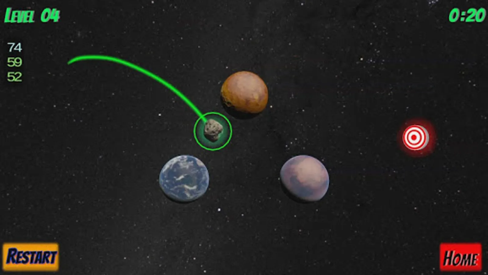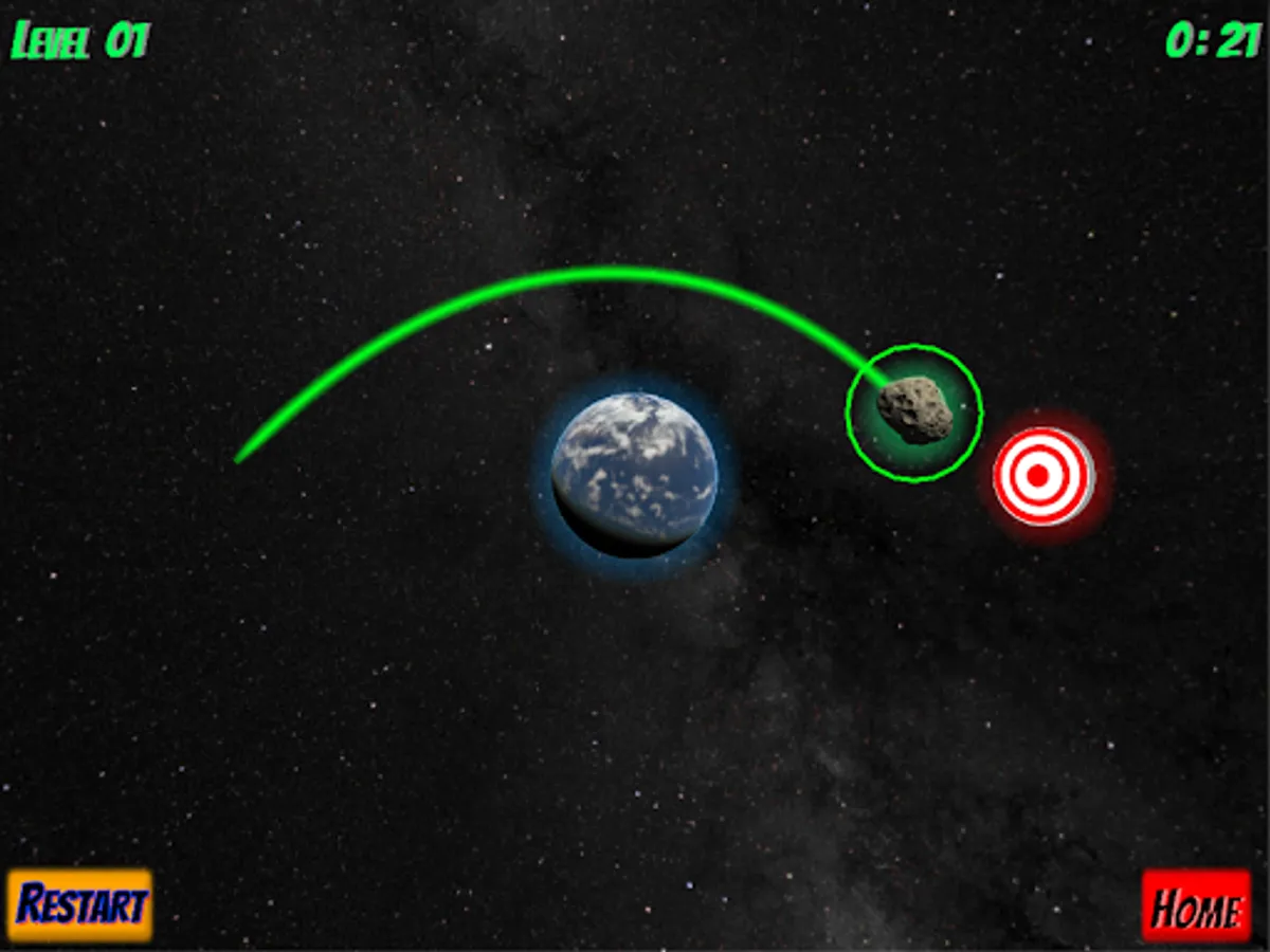 Pull back your asteroid, aim, and launch to try and hit the target.  Use the gravity puzzle of various planets and moons to guide your orbital path towards the big shiny red and white target!