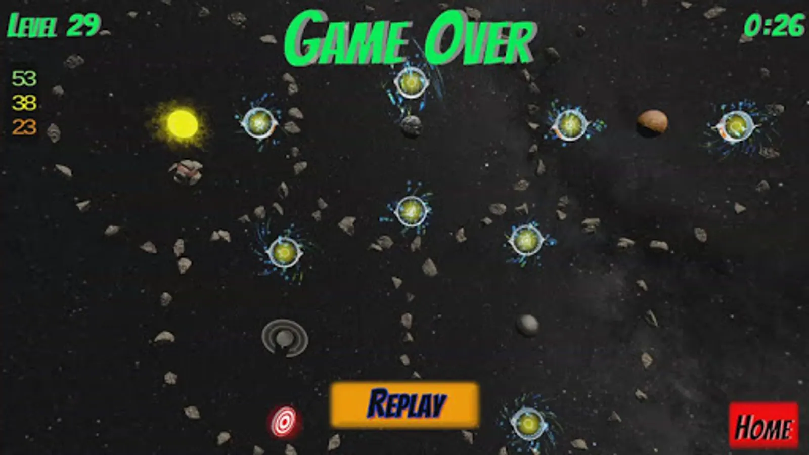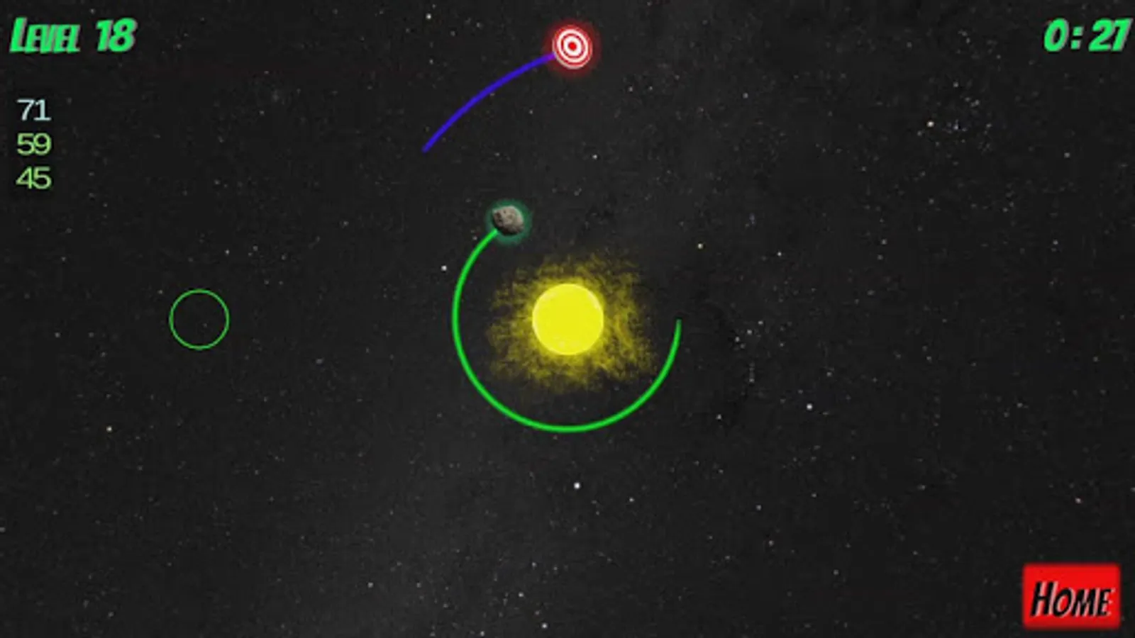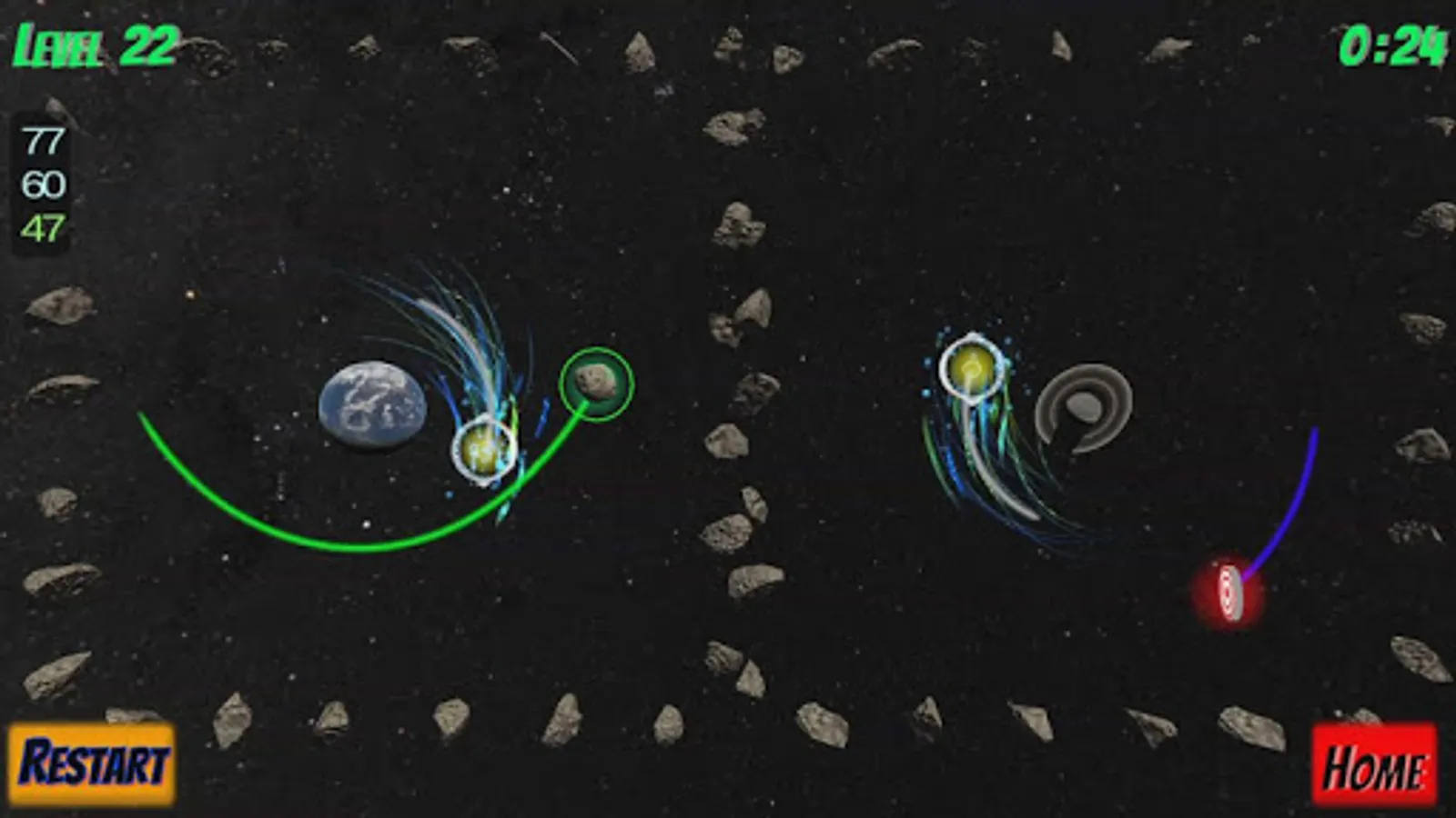 Watch out for orbiting moons, planets, and the target itself! Each obstacle can also exert a gravity force on the player asteroid so plan your trajectory carefully!