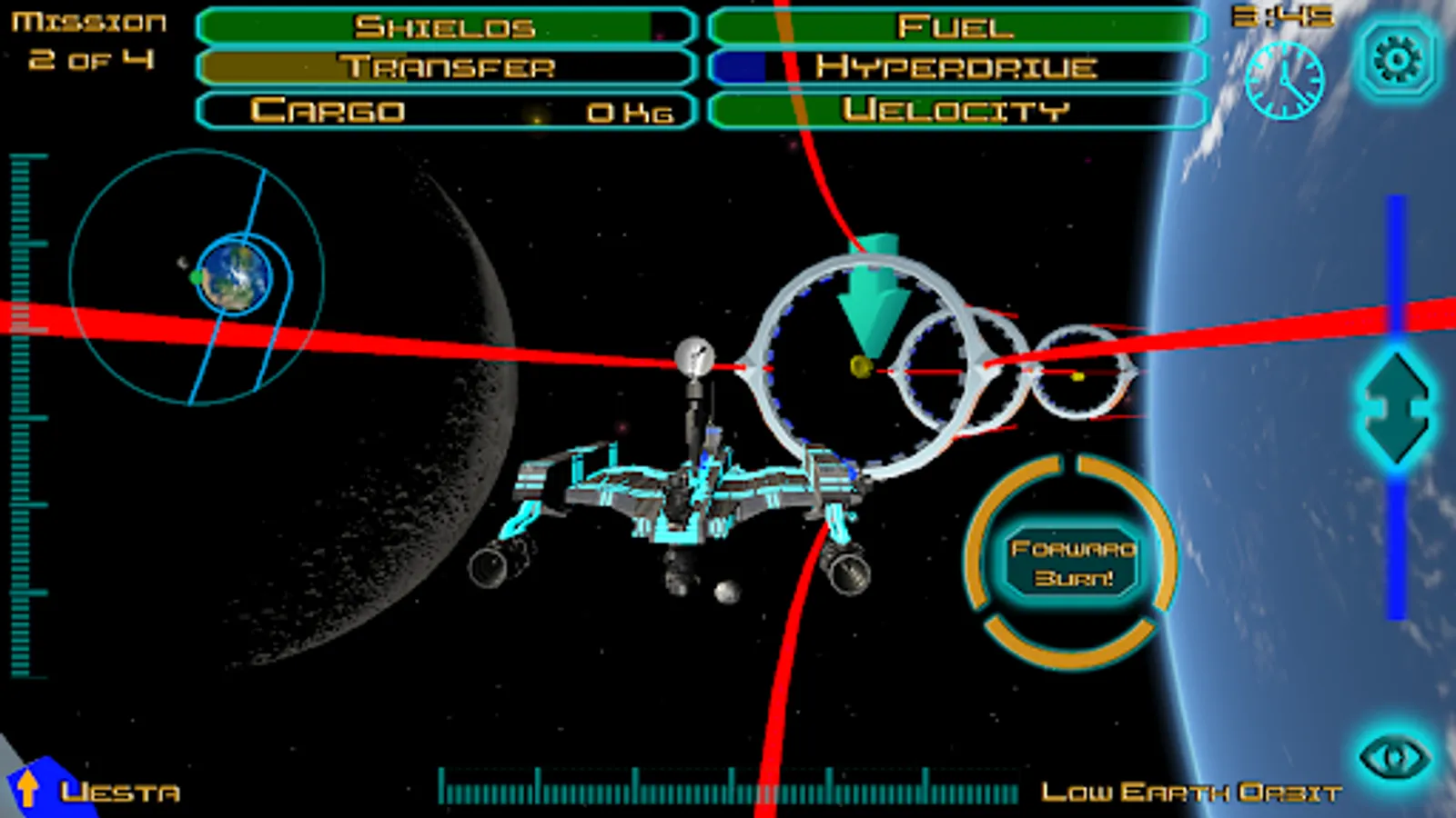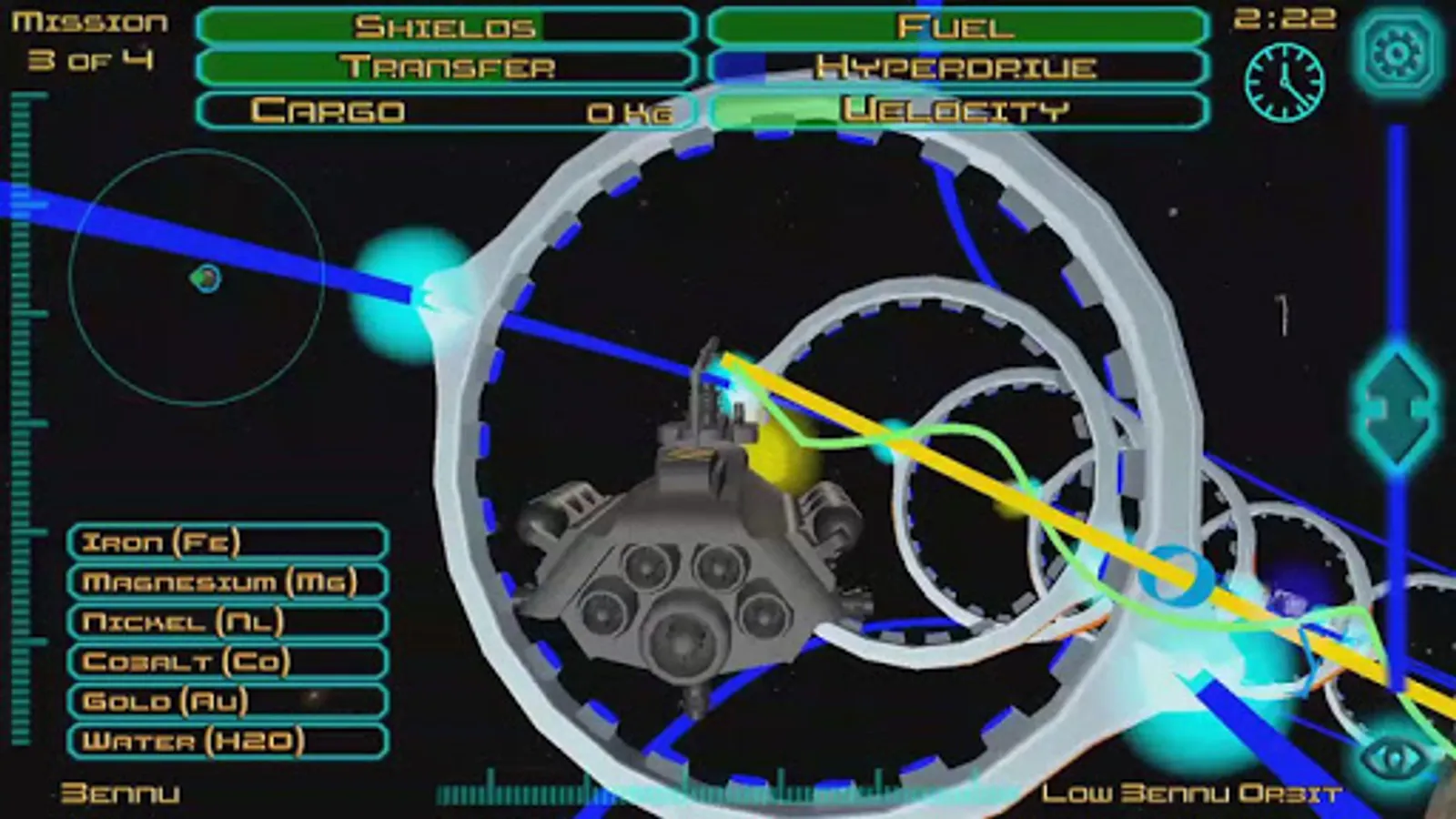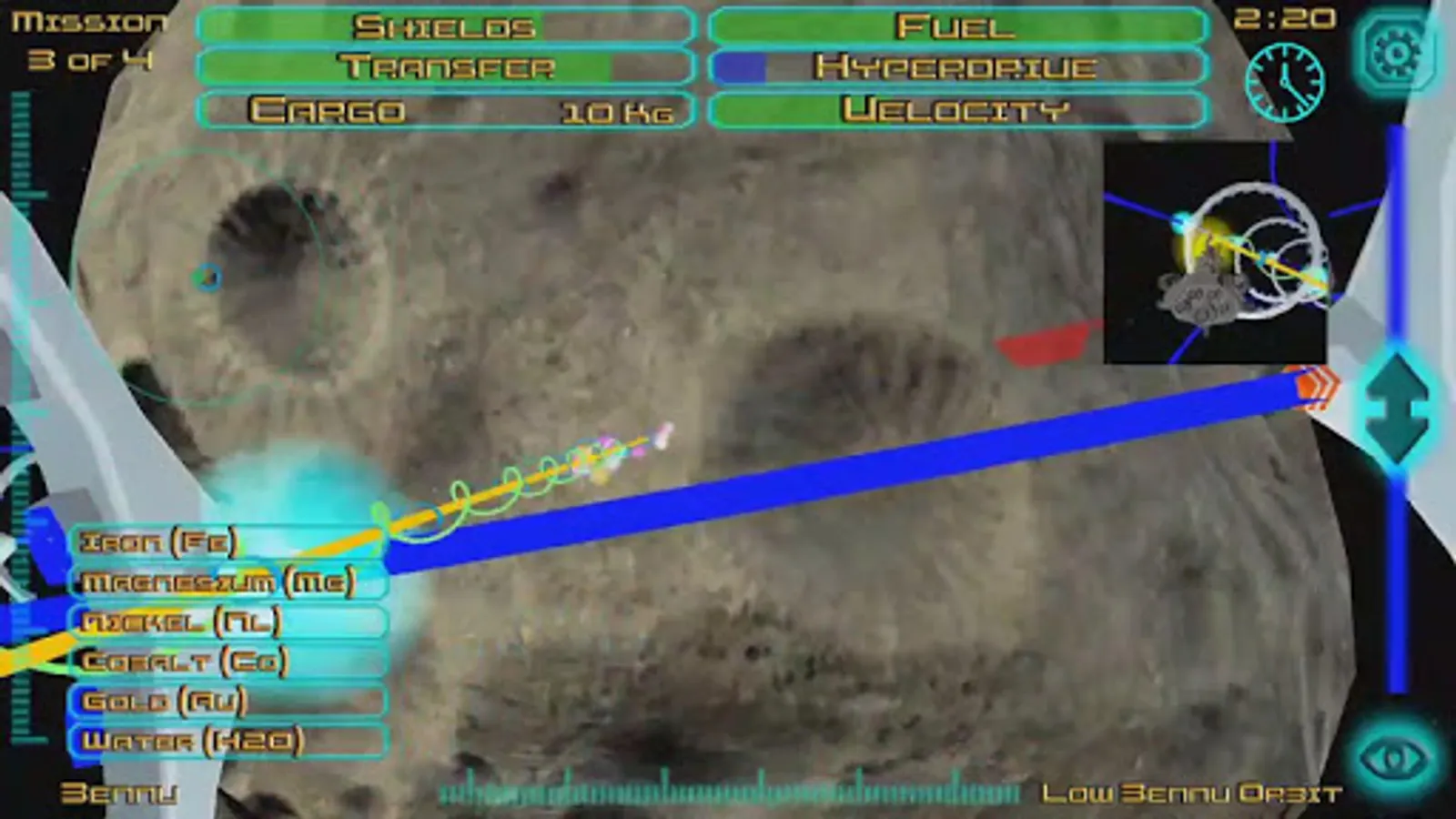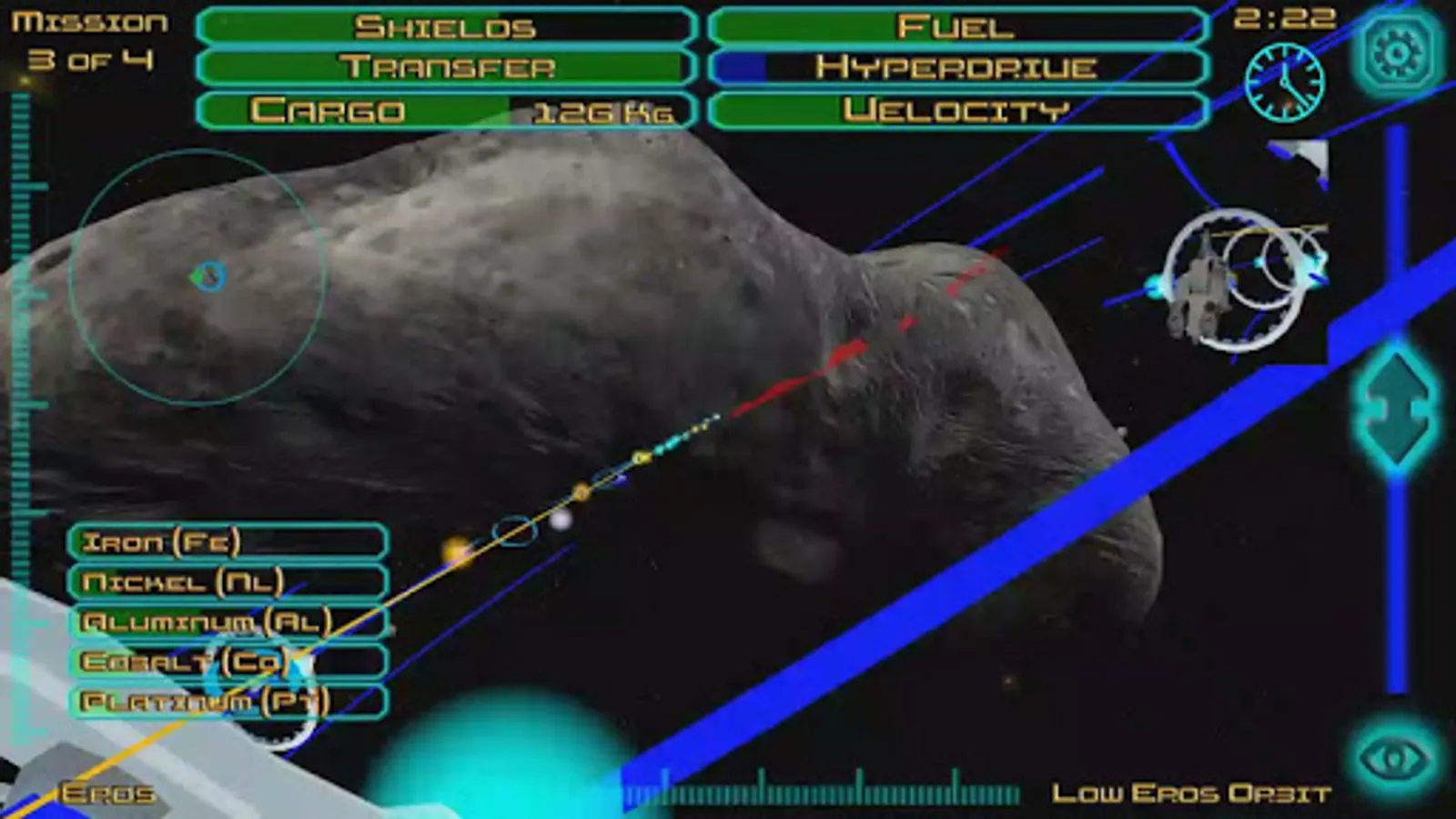 Execute orbital transfers and complete 4 round trip journeys from Earth to one of many Near Earth Object asteroids. Transfer to each successive orbit as close to the target as possible to gain extra bonuses! Fill your cargo hold in low asteroid orbit and sell your ore for changing prices once you make it back to earth.