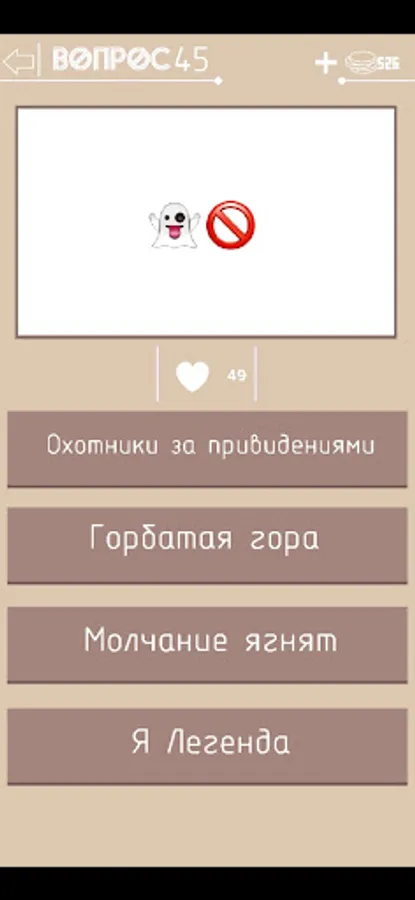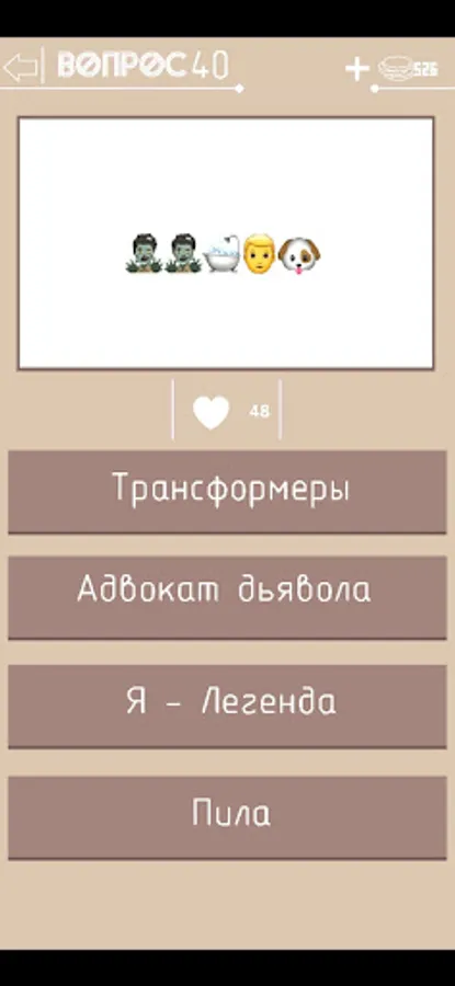 In the "One of four options" mode, you need to choose one of the four proposed movie titles. For each wrong answer, one life is lost.