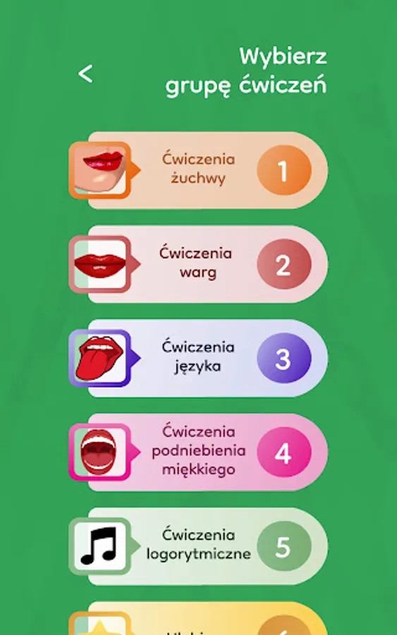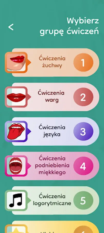 At the moment, the application offers 15 exercises, contained in five groups. We distinguish the following exercises: jaw, lips, tongue, soft palate and logorhythmic exercises 📃
