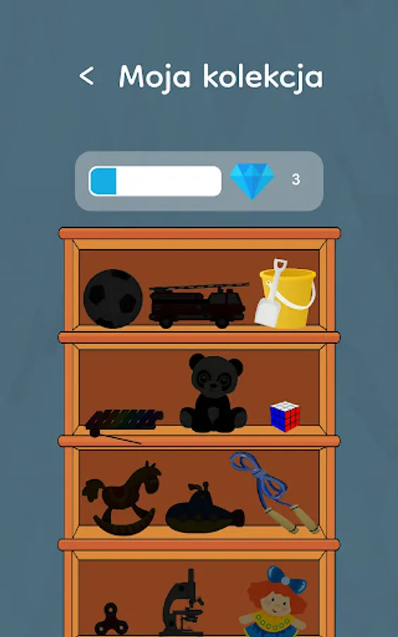 Each time an exercise is successfully completed, points will be awarded in the form of a reward selected by the user. The child can unlock their trophies in the form of interactive toys placed on the bookshelf 🧸🪀