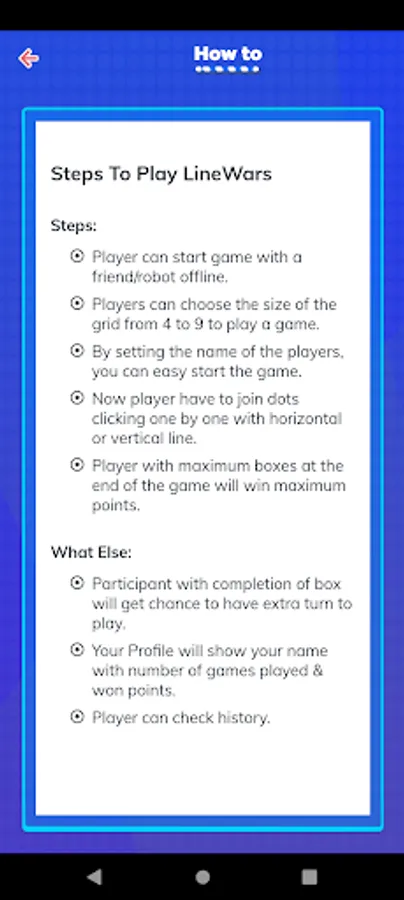 Here is a small description of the first Game: Link the dots, close more squares than your opponent and win. Objective of the game is to link any 2 dots and close the squares. The player who closes the most number of boxes wins. You and your opponents take turns to connect dots by adding a single horizontal or vertical line between 2 adjacent dots.
