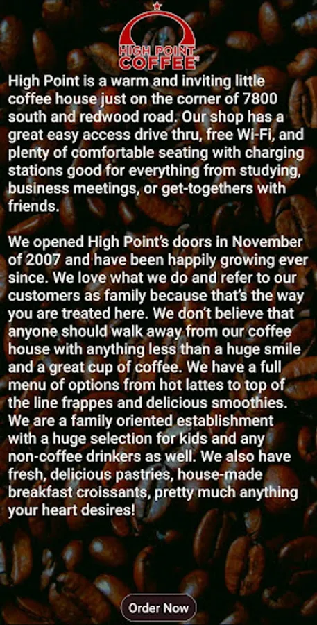 We opened High Point’s doors in November of 2007 and have been happily growing ever since. We love what we do and refer to our customers as family because that’s the way you are treated here. We don’t believe that anyone should walk away from our coffee house with anything less than a huge smile and a great cup of coffee. We have a full menu of options from hot lattes to top of the line frappes and delicious smoothies. We are a family oriented establishment with a huge selection for kids and any non-coffee drinkers as well. We also have fresh, delicious pastries, house-made breakfast croissants, pretty much anything your heart desires!