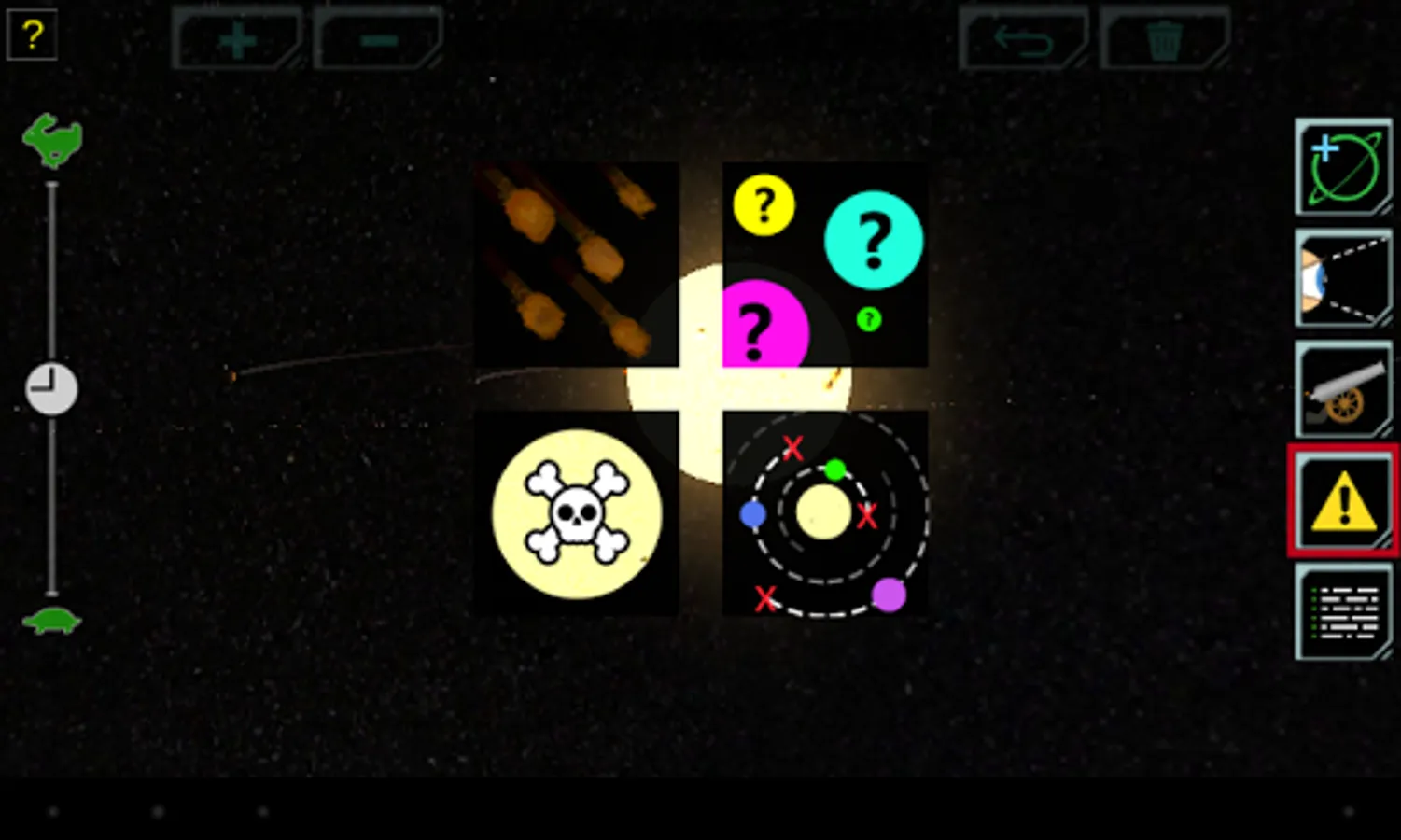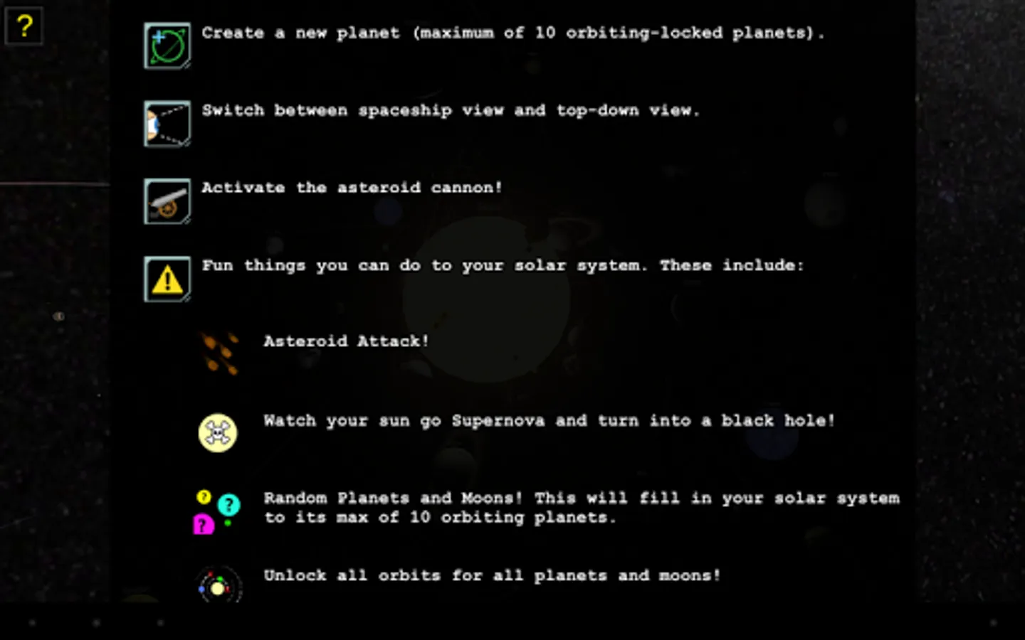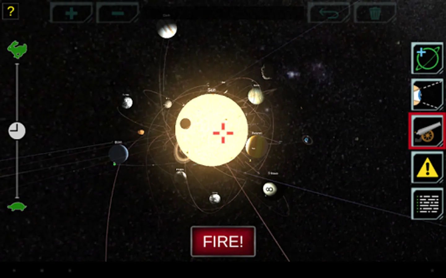 Want to make things interesting? Press the asteroid attack button and watch as asteroids knock your planets out of orbit! Or, shoot asteroids at them yourself with the Asteroid Cannon.