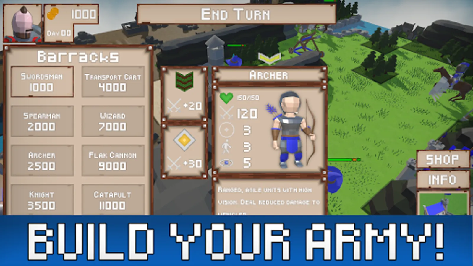 Wide array of units: Utilizing every unique unit type is the key to victory, Swordsmen are the bread and butter of every army but struggle to weave through the terrain as well as the Spearman can. Archers, Catapults, Battleships and magic wielding mages can blast your enemies from a distance! Knights and vehicular units can travel greater distances and utilize roads much better than others. Using specific units for different situations is essential in achieving victory!