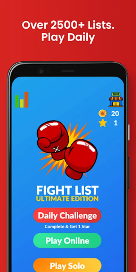 Don't you get irritated when you want to go through a fight list level without having to be connected to internet? Don't you want to play a game like Family feud, trivia crack, Wordle or other trivia games without having to always wait for new day. Now you can enjoy fight list ultimate categories game without any hassle or wait. Just download and play different fightlist categories. Randomly chosen from 2500+ trivia categories, enjoy Fight List family feud type category game as much as you like. Even if you like playing scattergories, fight list has got you covered. Just like in scattergories, you