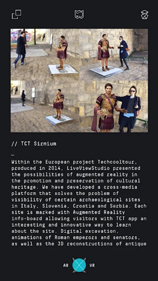 Holograd is an AR/VR mobile platform for systematic digital enrichment of public spaces, i.e. creation of a large database storing all relevant information about a particular site, its history, culture, sights, personalities, events and objects, enabling through diverse scenarios, an innovative form of communication and contemporary presentation of cities and cultural heritage as a whole. The project presents a unique regional mixed reality platform that already hosts more than 10 experiences, incl UNESCO heritage sites such as Felix Romuliana, but also contemporary street art projects.