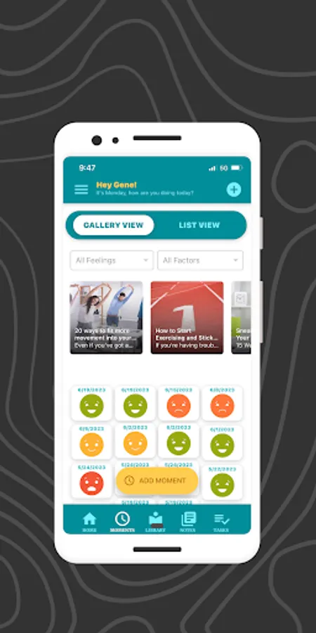 Viewing trending moments and feelings and accessing related uplifting articles, videos, e-books, and podcasts to address life issues.