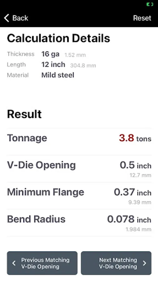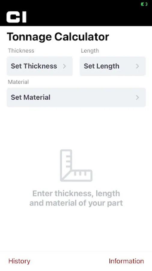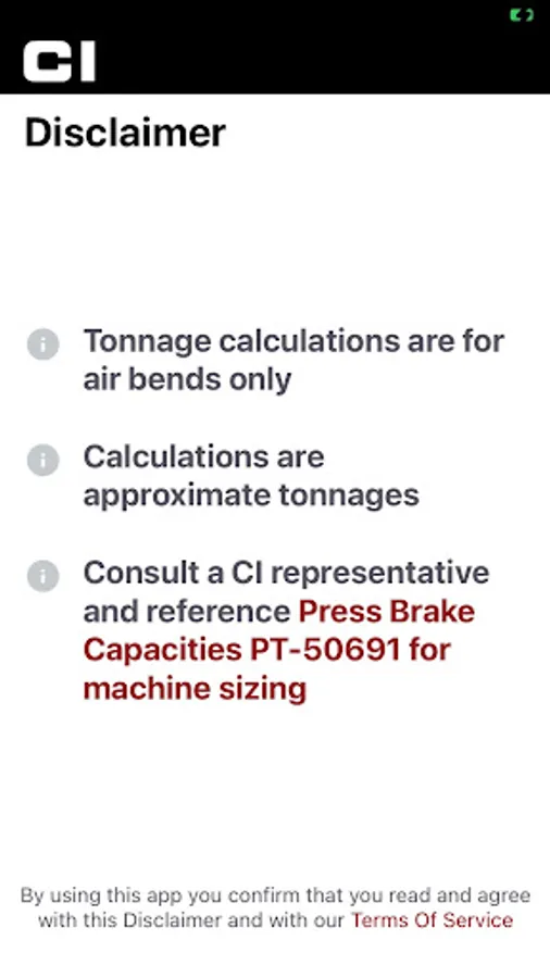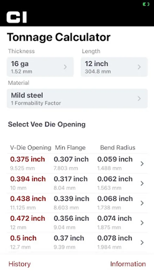The CINCINNATI Load Calc app is a must tool for any metal fabricator to calculate the air bend tonnage to form a part on a any brand press brake. The intuitive interface will guide the user through the process by allowing selection of material type, material thickness, and vee die opening. From these parameters, a tonnage will be calculated along with the minimum flange length and inside bend radius.