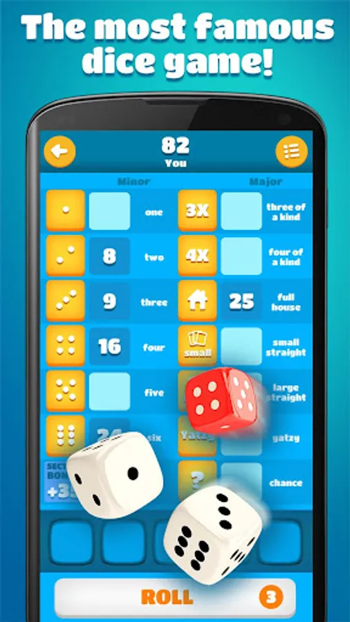 This dice game got various names over the years and continents : yatzy, yacht, yam's, yahsee, yatzi and so on, but what does not change is that it is very simple, fast to learn and fun to play!
