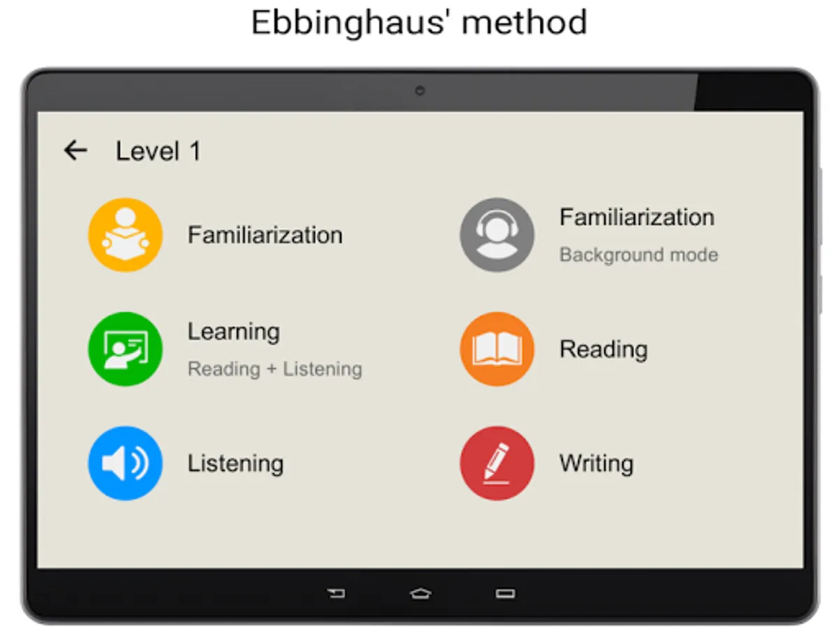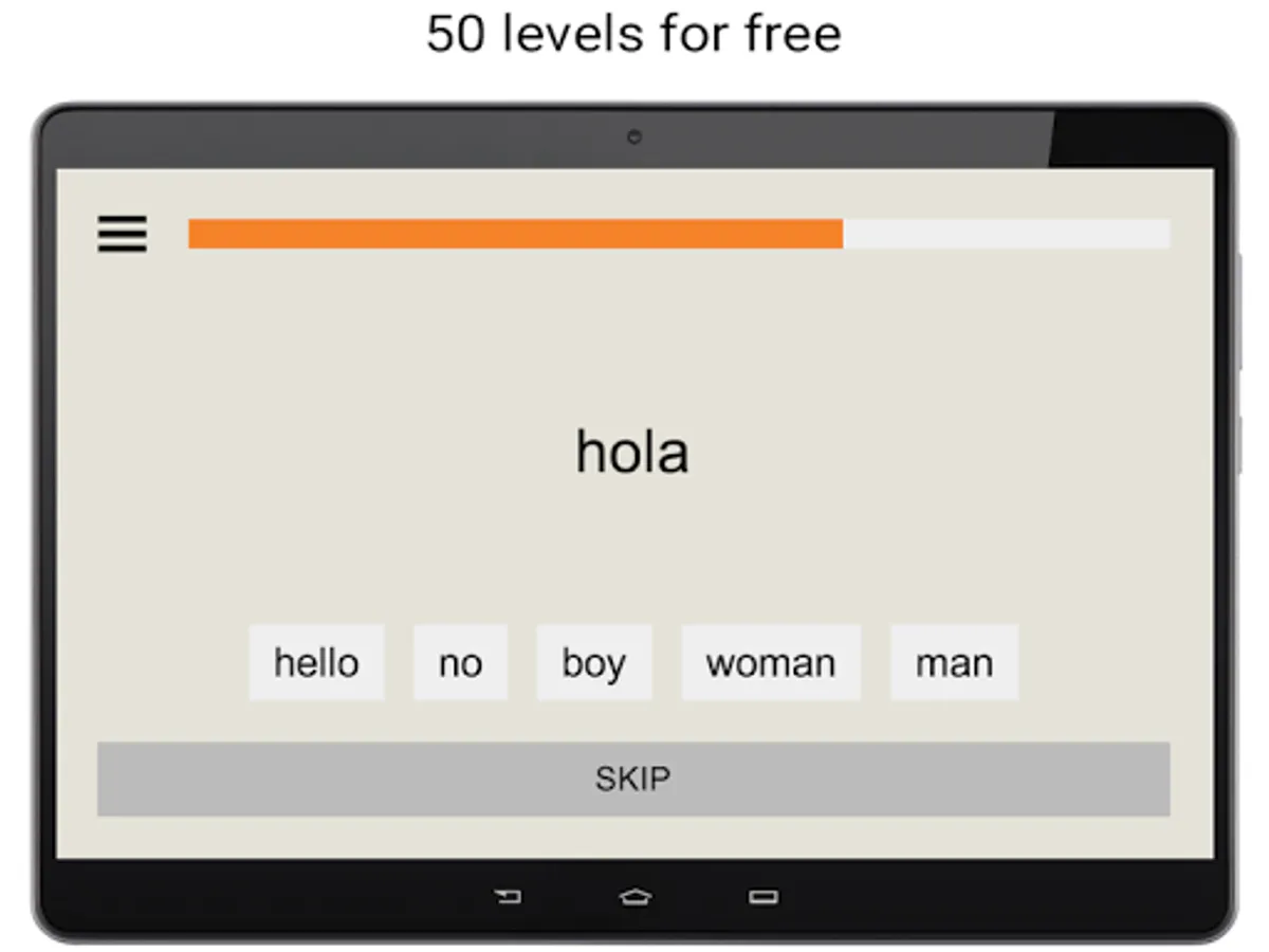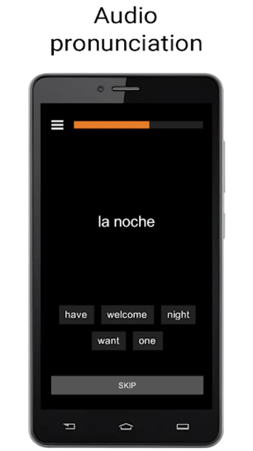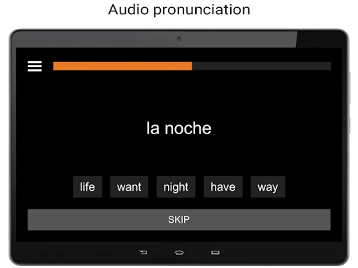 The application has an extensive vocabulary created on the basis of the frequency dictionary of the Spanish language - a set of words sorted by frequency of use in speech, where the most common and popular Spanish words are located at the top of the list. For convenience of study the entire vocabulary is divided into groups of words (levels) balanced by the number of parts of speech. The teaching process consists of several stages: