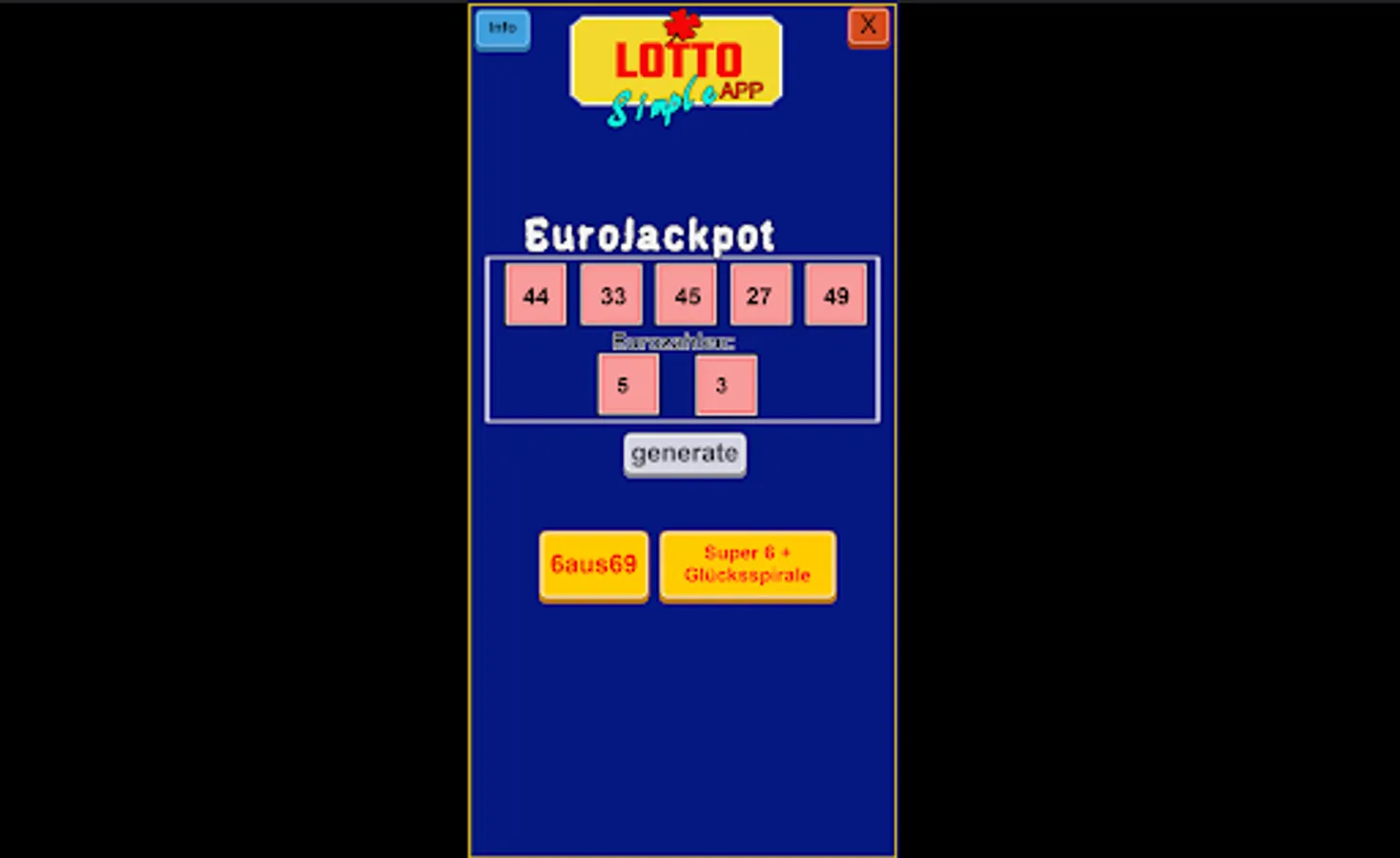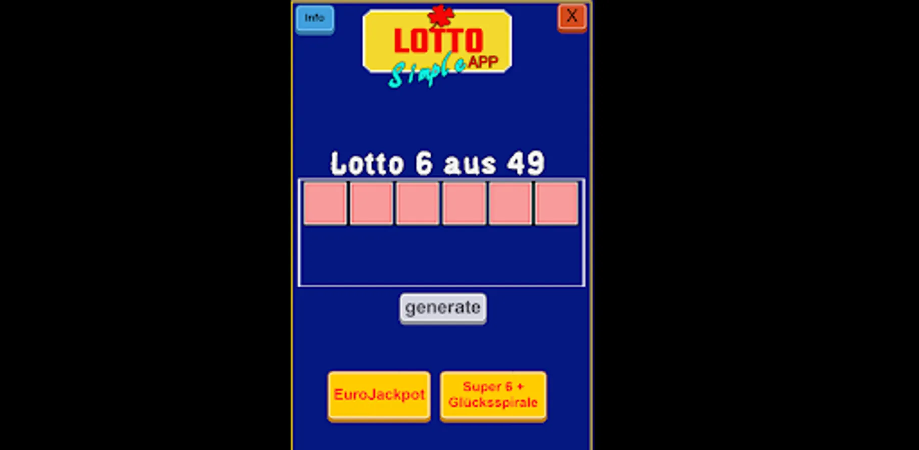 Diese App ist ein Zufallszahlen-Generator welcher sechs Zahlen ausgibt. Zahlen zwischen 1 und 50(Eurojackpot), sowie Zahlen zwischen 1 und 49 ausgibt für Lotto 6aus49.