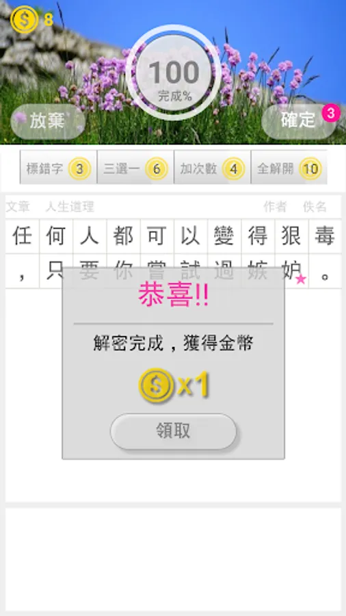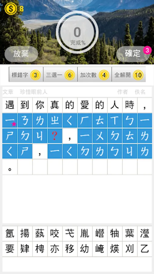 文章解謎的技巧為觀察每個字第一個注音符號,儘量選擇自己常見的字當作候選字進行排列組合,如真的無法解出來,可使用小幫手「標錯字」「三選一」「加次數」「全解開」來幫忙解題。