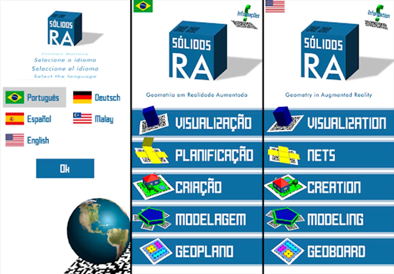 Solids RA is an application aimed at teaching geometry with augmented reality. It allows the visualization and manipulation of geometric solids from the reading of QR codes by an Android smartphone or tablet. Download and print the material with the QR codes used by Sólidos RA on the app's information screen, or on the link available at the end of this description.