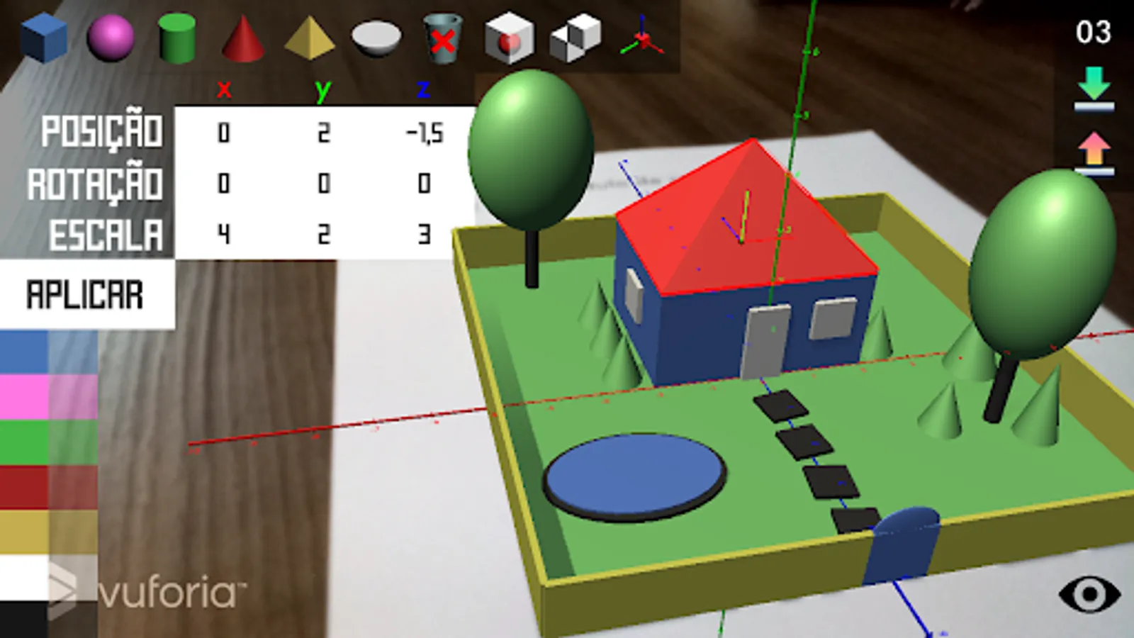 In the Creation module, the user has at his disposal an environment to create his own augmented reality scene from primitive objects, namely: the cube, the sphere, the cone, the cylinder, the pyramid and the semi-sphere. The user can use translation, rotation and scale operations to transform these primitive elements and generate scenes according to their creativity.