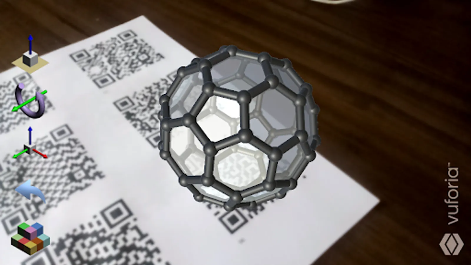 In the Visualization module, a collection of 42 geometric solids is available for the user to visualize and interact with. The application has different ways of viewing solids, showing or not showing edges and vertices, and making faces transparent or opaque. It is also possible to change the height at which the solids are presented in relation to the QR Code, rotate and scale the objects.