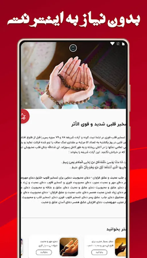 The law of attracting love and returning the beloved is guaranteed by praying for love and affection. The law of attraction is one of the most important and main emotions of every human being. Love is a very deep and pleasurable feeling that exists in the hearts of all people. In prayer to attract love and affection, we intend to fully teach you the law of attraction of love and the half-lost. As much as possible, I tried to prepare the most complete and comprehensive program in the field of prayer to attract love and affection for you. If you are looking for a great relationship or you want to improve your relationship, praying for love is a key for you. So join us in praying for love and affection. There are different types of spells that are explained to you in the prayer application to attract love and affection. In the prayer application to attract love and affection, we will introduce you to different types of spells. You can also use the prayer program to attract love and affection offline. Love spell - Love spell, like any other type of spell, consists of several types. Is. Use the prayers, the writings of the prophets or the guardians of the prophets who have given a prayer for each problem to achieve your desire in the program of conquest of the heart. The heart conquest prayer method is one of the purest methods you can do for love. In the app, "Conquest of the Heart" also includes items such as the Jewish love spell, the love spell of a dove egg with black pepper, remote control, how to use the love spell, the signs of the love spell, attracting love and facilitating marriage, the prayer of love and attracting a son Favorites, prayers to sit on the heart, prayers to conquer the heart for marriage, fast burning of salt, and the like are mentioned. Please install this app and send us your comments about Heart Attraction Prayer.