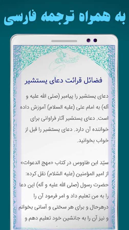 Download Farahmand Audio Prayer right now. Text typing is now available. Yastshir prayer with Persian translation is installed on all Android phones and tablets. Whoever recites the Yastshir prayer with Persian translation three times, may God fulfill any good need he has in this world and the hereafter. It has been narrated from the Commander of the Faithful Ali (AS) that the Prophet (PBUH) taught me the Yastshir prayer with a Persian translation and ordered me to memorize it at all times in difficulty and comfort and to teach it to the caliphs after me. Listen to the prayer of Farahmand and listen to its virtues. Farahmand Audio Prayer is designed to be very pleasant and listening. You can always use text Yastshir. Yastshir is a very user-friendly text designed. Readable and beautiful text is a feature of this program. Yastshir is the text of a treasure of divine treasures. Sayyid Ibn Tawwus narrated from the Commander of the Faithful (pbuh) in the book "Mahjah al-Dawaat": The Holy Prophet (pbuh) taught me the prayer of Yastir and ordered me to recite it in any case and for any difficulty and ease, and also to teach it to my successor. And do not stop reading this prayer to meet the Almighty; And he also said: O Ali, recite this prayer every morning and every evening, because it is one of the treasures of the Divine Throne. Ubayy ibn Ka'b begged the Prophet (peace and blessings of Allaah be upon him) to recite the virtue of the supplication, and he said a few of its many rewards; Anyone who wants to refer to the book "Mahj Al-Dawat".