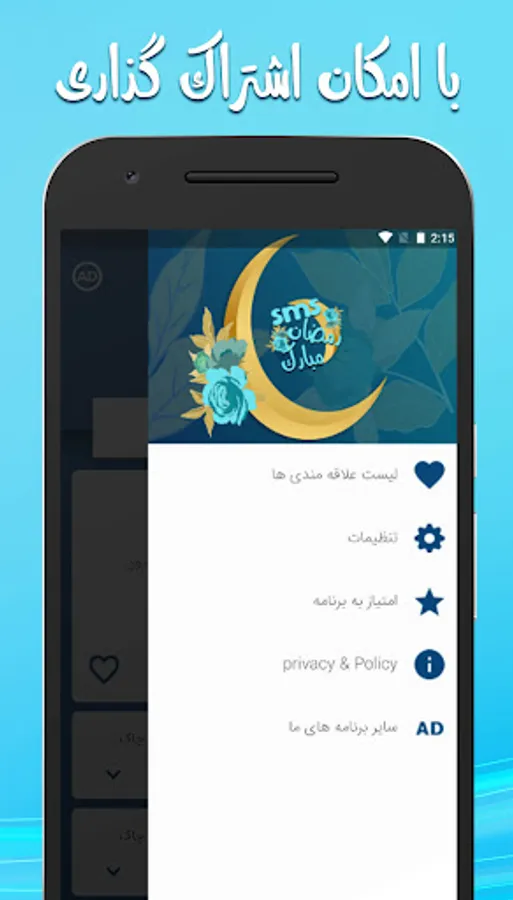 The reward for breaking the fast of a believer during Ramadan is equal to freeing a slave. Ramadan is known to us Iranians as the month of the feast of God and is very important. It records Sahari in the minds for years. The Happy Ramadan greetings SMS application has been produced and designed to go with it to celebrate the holy month of Ramadan. Congratulations to your friends and acquaintances on the coming of this month with the Happy Ramadan greetings SMS application. One of the features of the Happy Ramadan greetings SMS application is the interest menu. Have a collection of the most beautiful Ramadan SMS together. The ability to share is also available in the SMS program of Ramadan. The SMS of Ramadan is also searchable. A menu of interest has also been created for you in the SMS of Ramadan. Happy Ramadan greetings SMS has a suitable volume. Happy Ramadan greetings SMS program is designed to be user-friendly for you dear ones. Happy Ramadan SMS includes a list of the best messages.