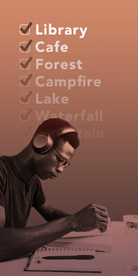 Autumn Forest atmosphere under the Forest category and calm your mind easily. If you can't read your book in a crowded place just select Waterfall under the Water category and isolate yourself easily.