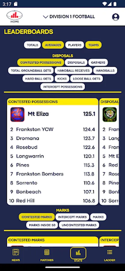 View a comprehensive statistical breakdown from all games across both Div 1 and Div 2.