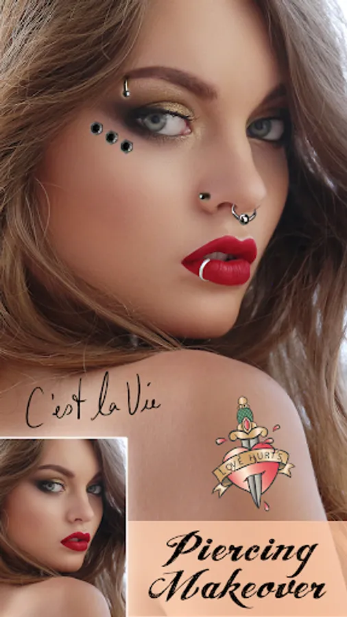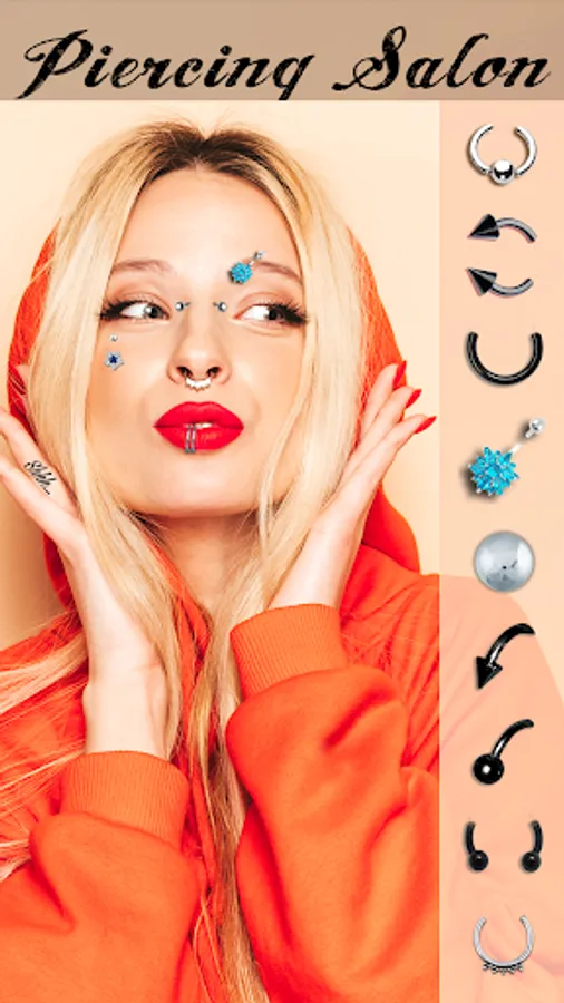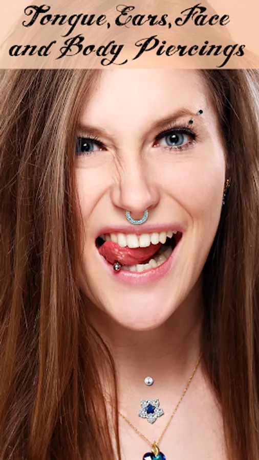 "Try On Piercing Photo Montage" lets you try different piercing styles without any pain! Check out these amazing ones for free! "Body piercing", "septum piercing", tongue, lips, nose, cheek and eyebrow piercing for men and women, belly button rings and much more!
