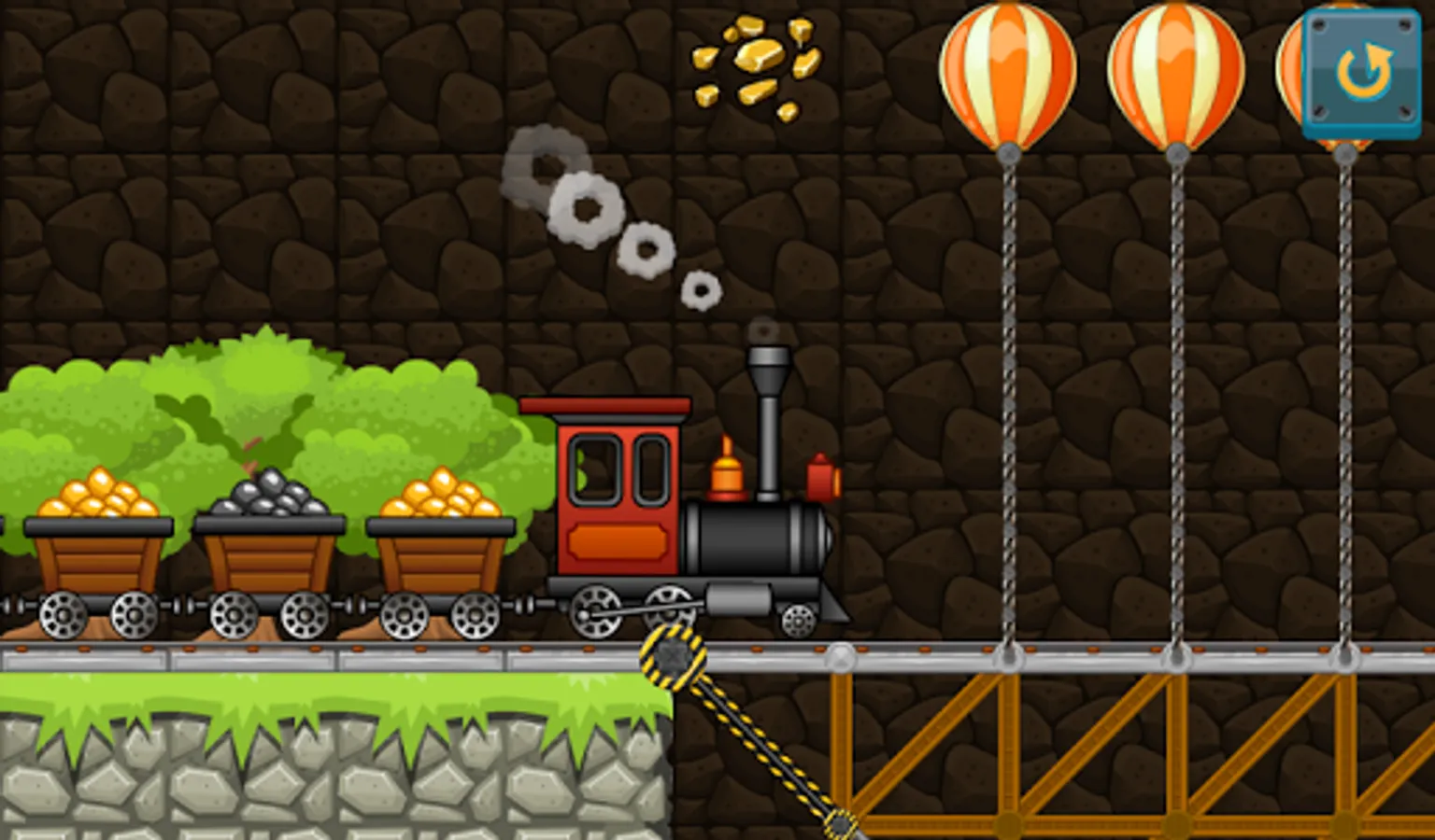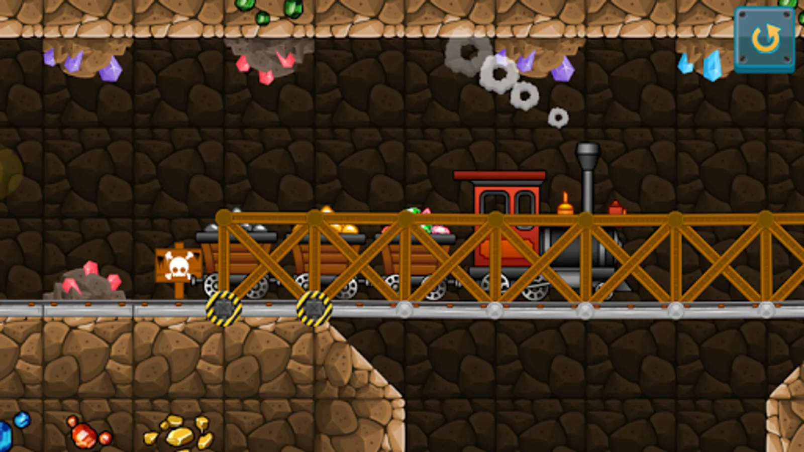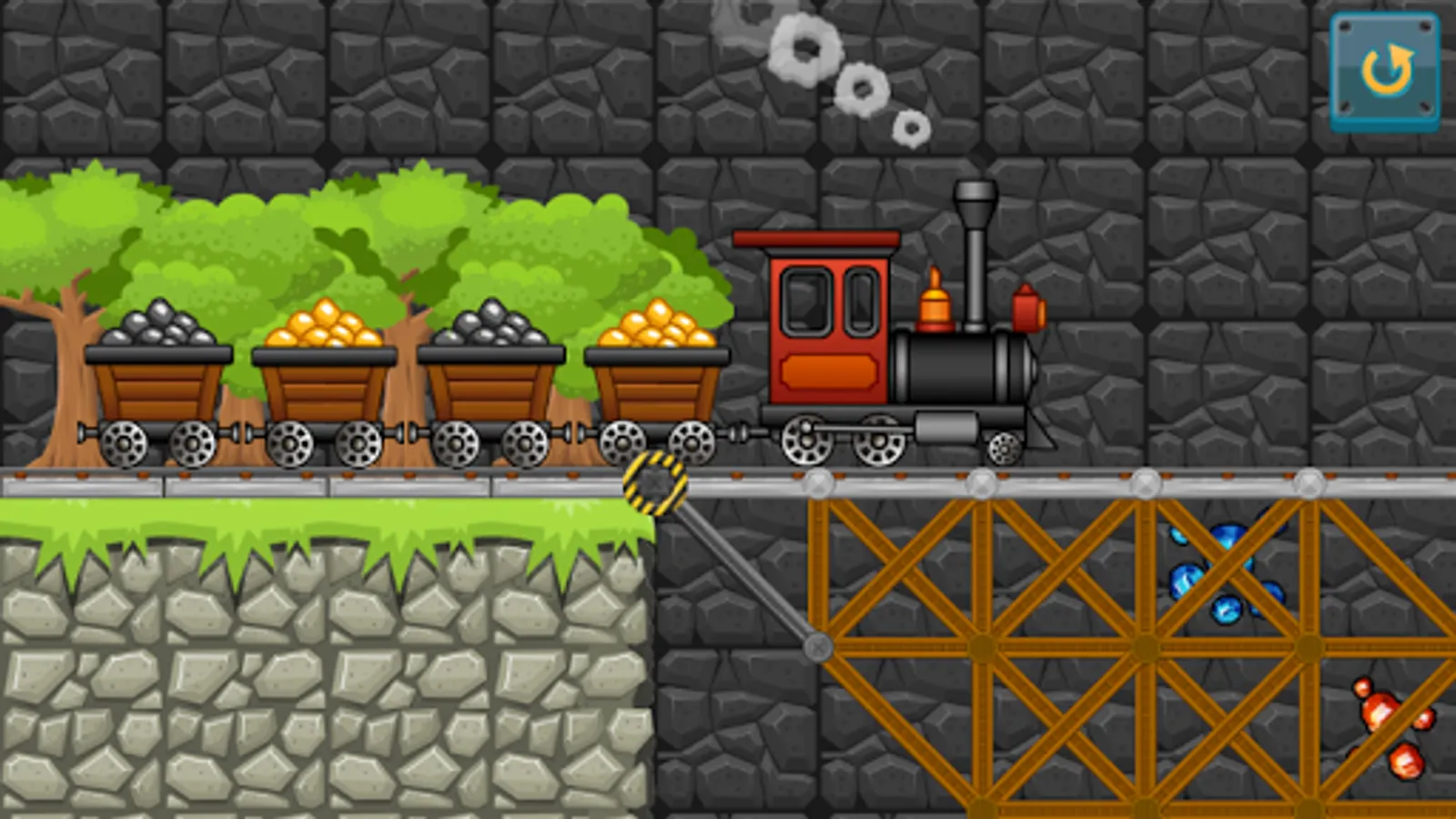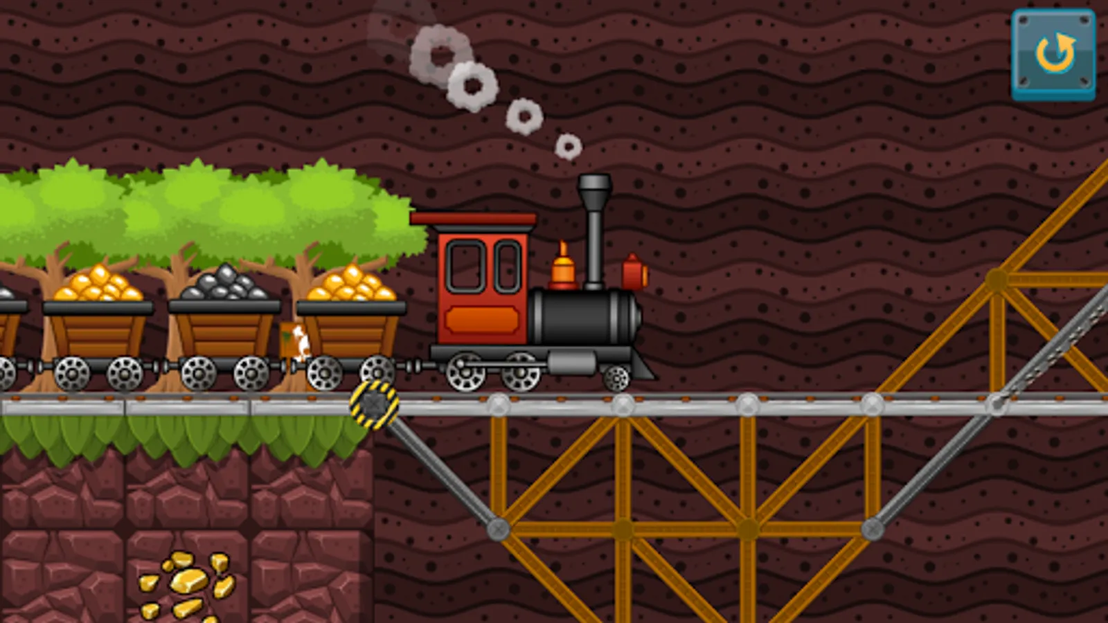 Construct railroad bridges using different materials: wood, steel, reinforced steel, ropes and balloons. Polish your creation until a steam train can pass safely. Avoid building simple box constructions, place X or inside the box so that it becomes stable. Watch out for blue and red stress on bars while testing, or the bridge can fail.