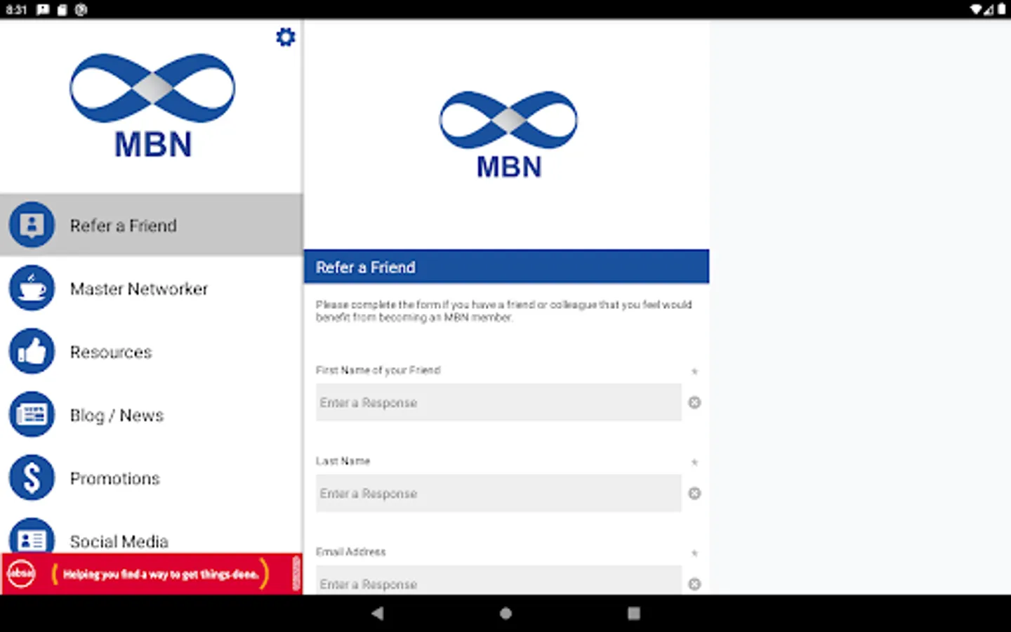 The app features a directory of MBN approved service providers and suppliers, as well as blogs, resources, promotions and an event gallery.