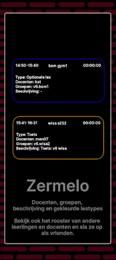 Zermelo: View your school schedule with information such as teachers, location, description and class type through colored agenda items in the schedule interface. Also view the schedule of other students and teachers in your school and save your friends to access their schedule more easily.