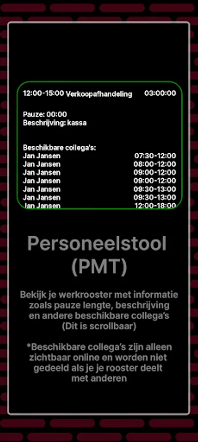PMT: View your work schedule with information such as break time, description and available colleagues without having to log in every time.