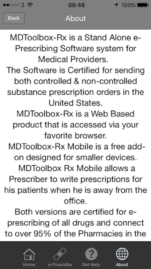 MDToolbox Rx Mobile is a certified mobile e-Prescribing solution that allows medical providers to write and electronically send prescriptions to U.S. pharmacies. It is free for all MDToolbox-Rx Web users.