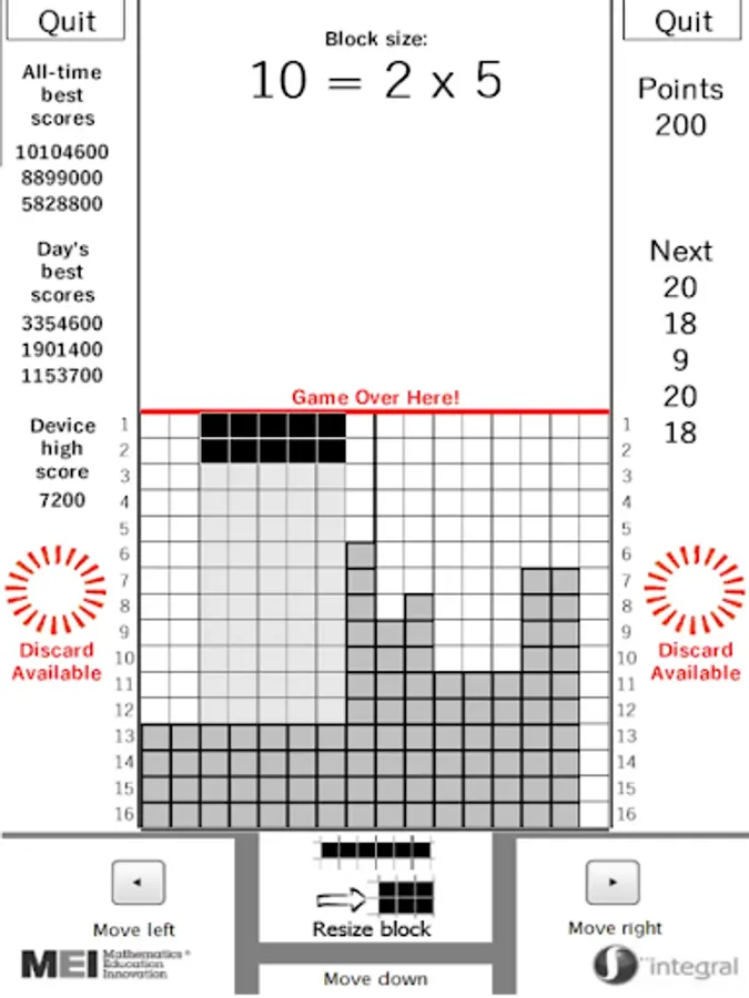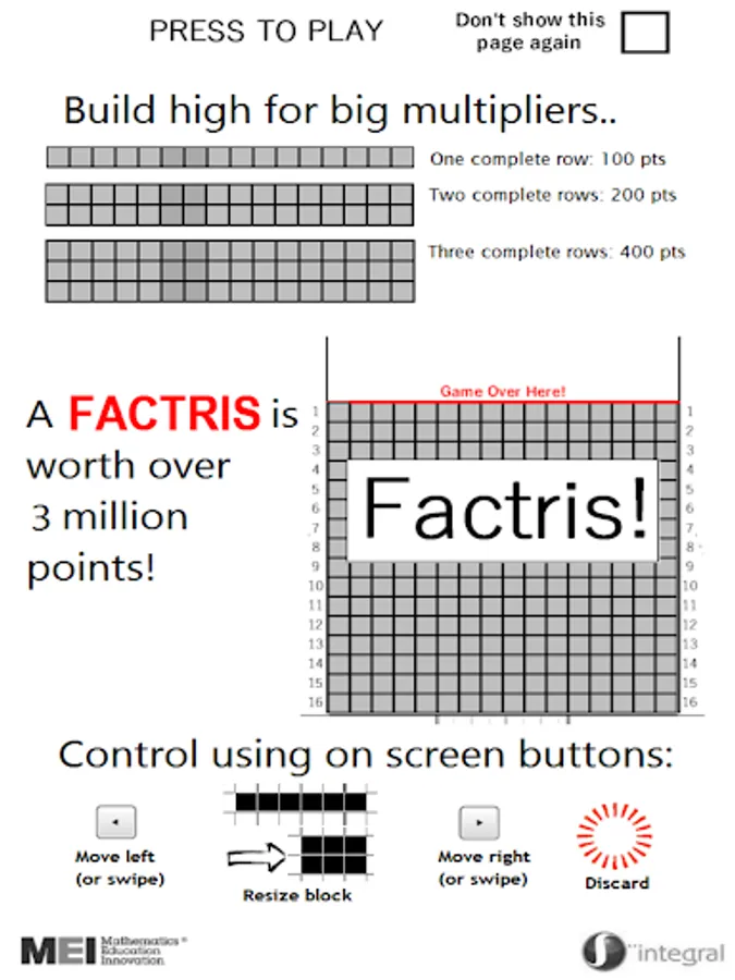 Factris is a classic risk reward high score game. Resize the dropping rectangles according to their factors and pack them together. Factris is challenging (there is no undo) and you need to pay close attention to the size of the rectangles coming next. Improve your numeracy, packing and knowledge of factors with Factris.