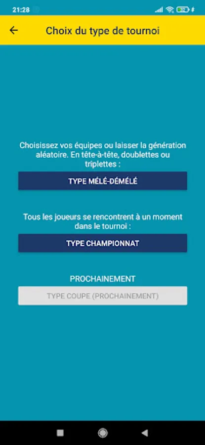 Each type of tournament can be carried out head-to-head, doublet or triplet. If you choose the doublet and you are an odd number, then the matches will be completed by a triplet or head-to-head.