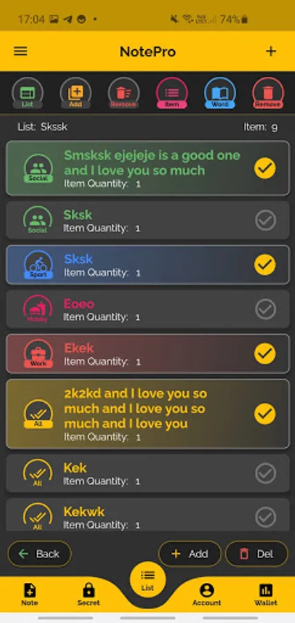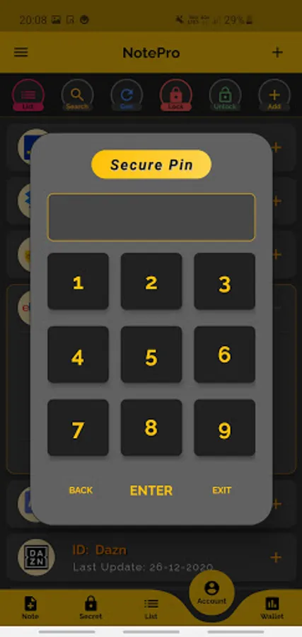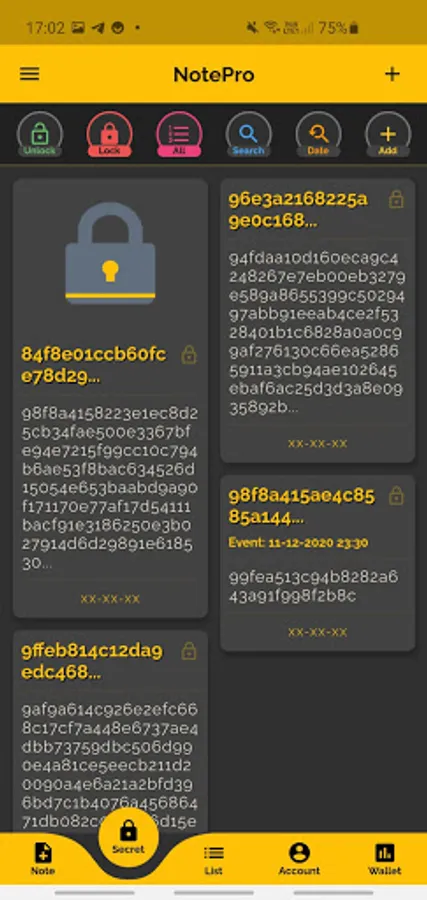 Save your Secrets, you can add images, a notification date and choose the type of priority. Once you enter the PIN code, set initially, you can view your secrets and use search tools.