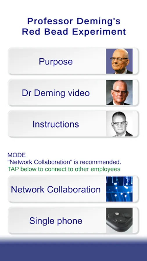 The app includes powerful, built-in, one touch, multi-user networking. This allows a remote meeting of a group of people to carry out the Red Bead Experiment, at simultaneous locations across a company, or across the world. This app is the ideal, interactive, non contact, distance learning.