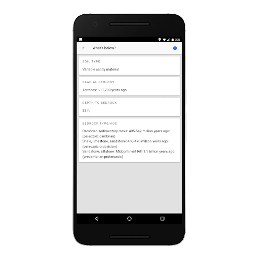 Tap anywhere on the map within Minnesota to get information about the soil, glacial geology, depth of the bedrock below the land's surface, and the types and ages of the bedrock in that location. Press the 'below me now' button to instantly get the above information about your current GPS determined location.