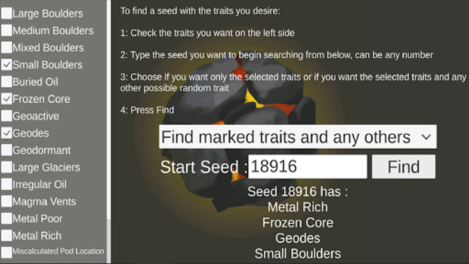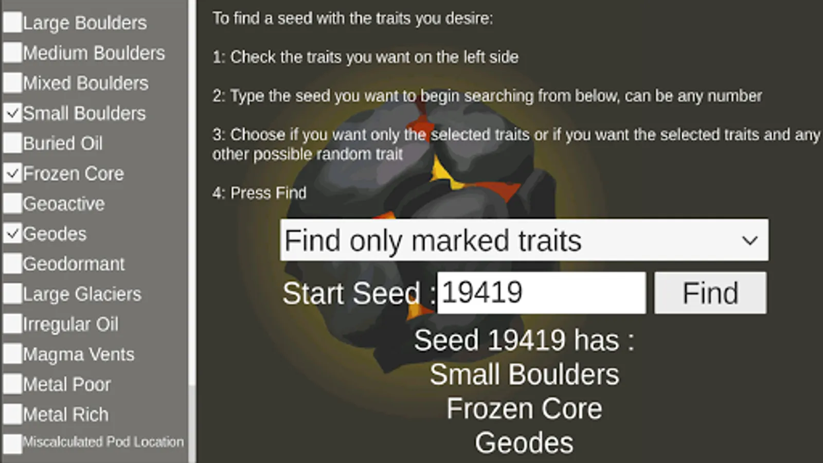 Please note it can only find the traits, it cannot count how many Volcanoes/Geysers are present.