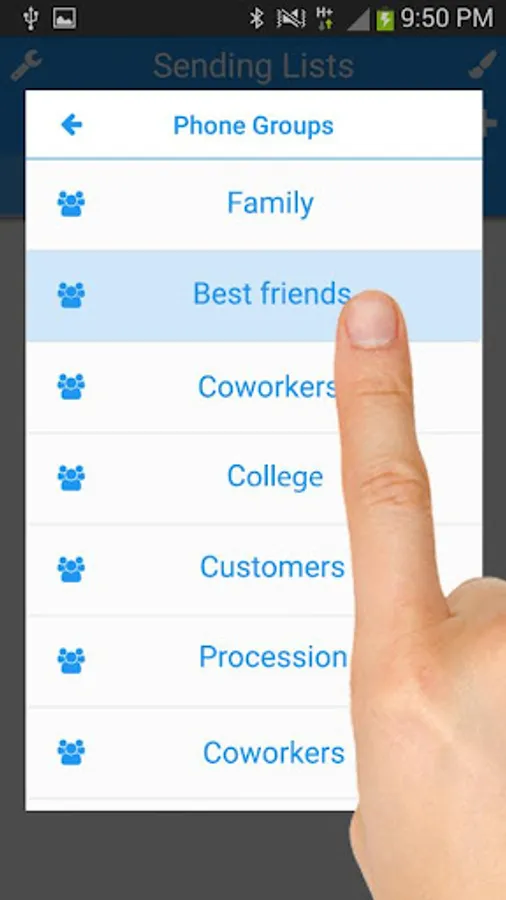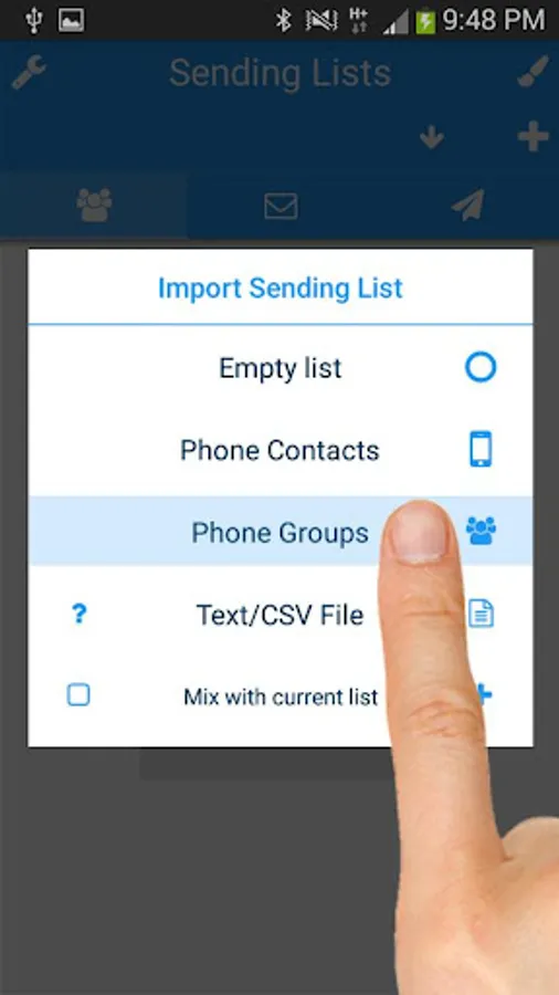 ✔ Create sending lists from phone contacts / groups / TEXT or CSV file .