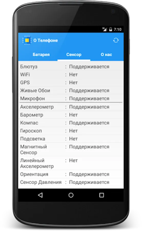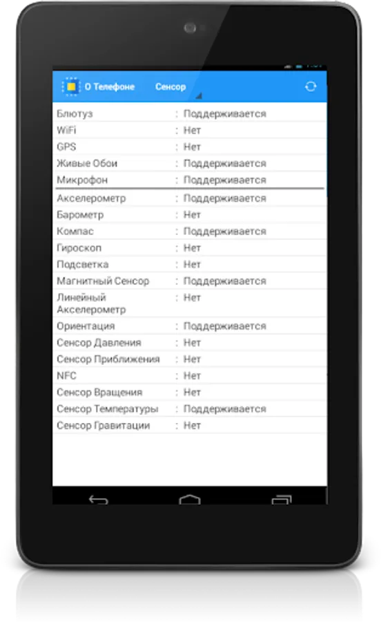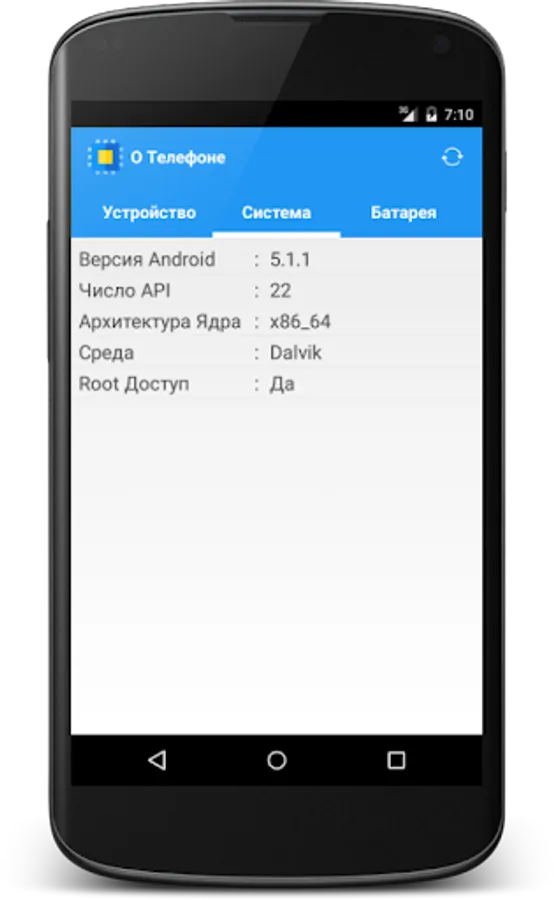 CPU type, the core architecture of the number of nuclei and their speed, the real amount of RAM memory, support for sensors, the version of android presence Root rights, information on your phone or tablet battery. The app is free and in Russian.