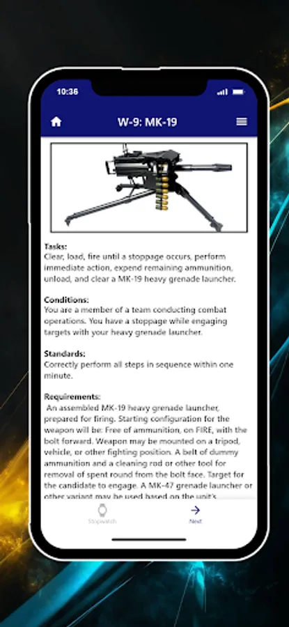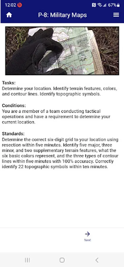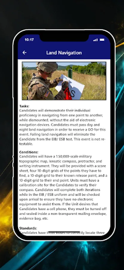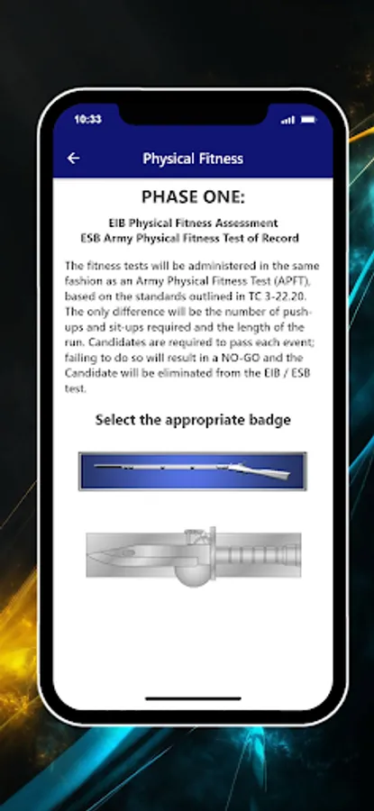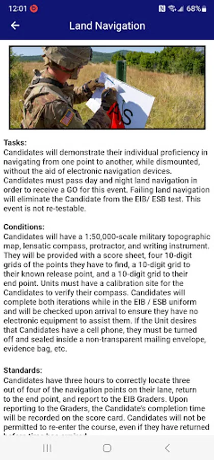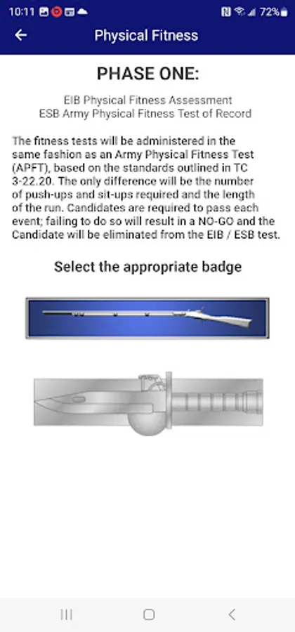 This application was designed to give Soldiers a digital study guide for the Expert Infantryman and Expert Soldier's Badge. The information provided derives from USAIS Pamphlet 350-6 (Expert Infantryman's Badge) and TRADOC Regulation 672-9 (Expert Soldier's Badge), the governing regulation for training and testing requirements. Additionally, this application contains the updated physical fitness requirements for ESB Candidates.