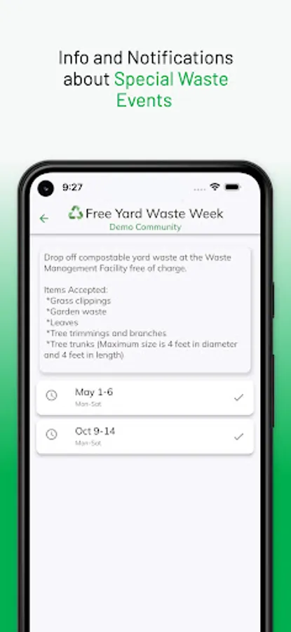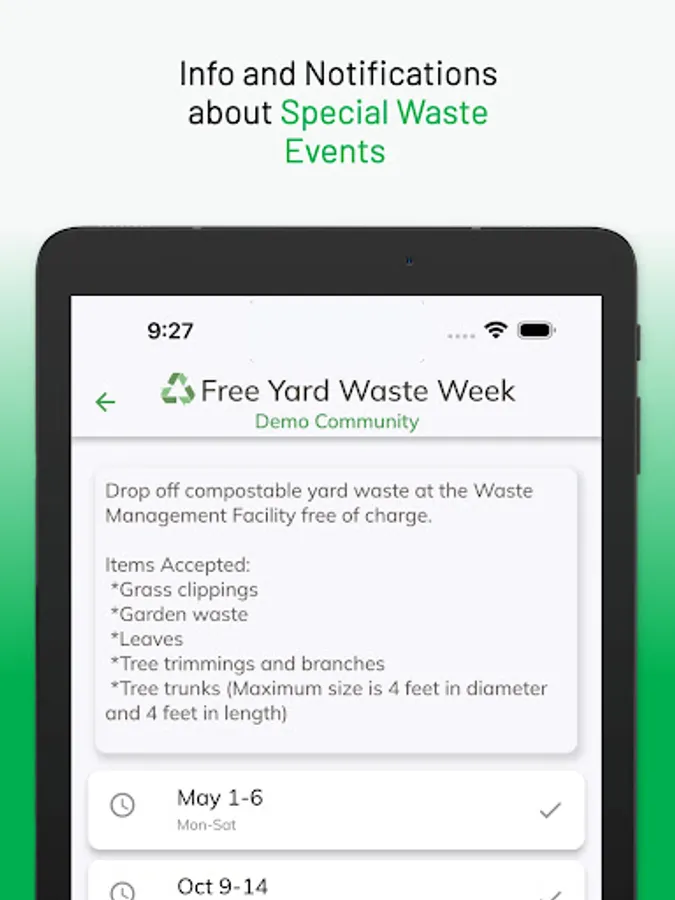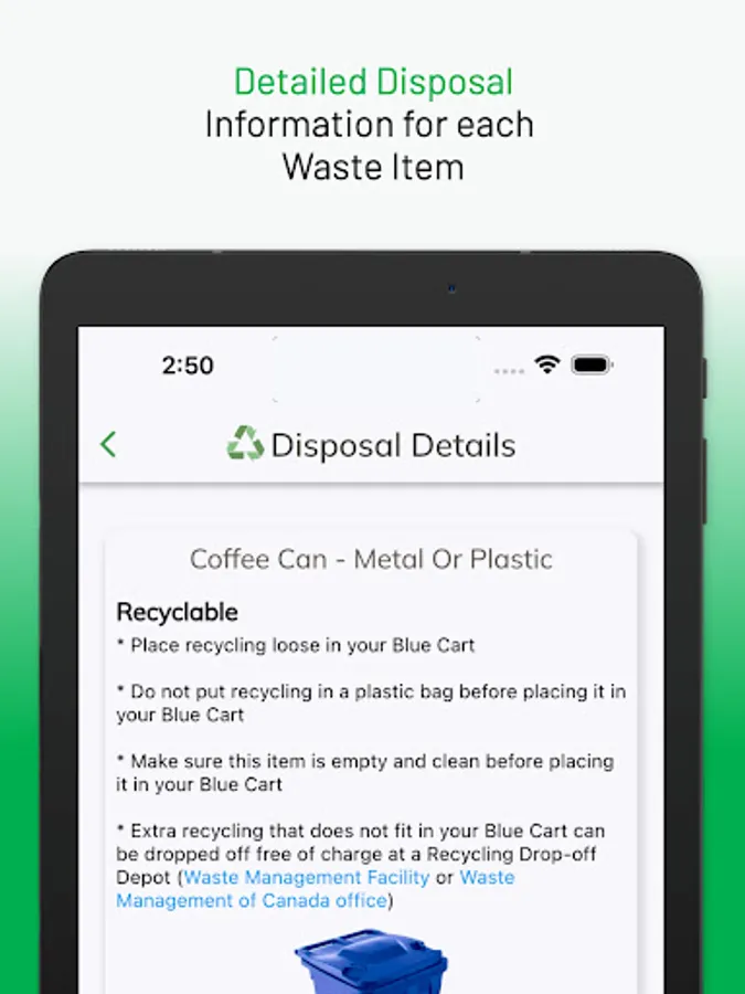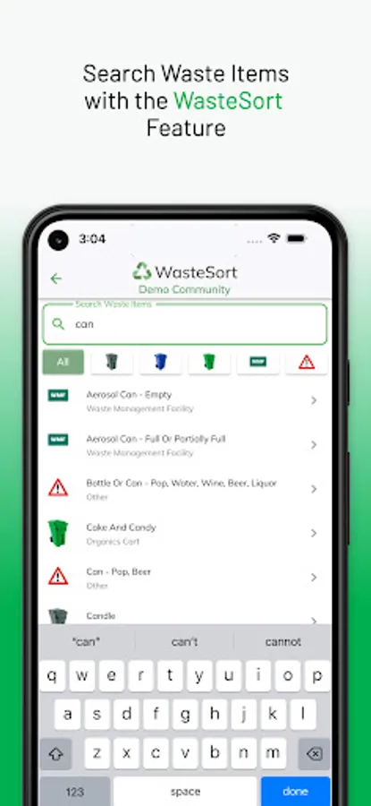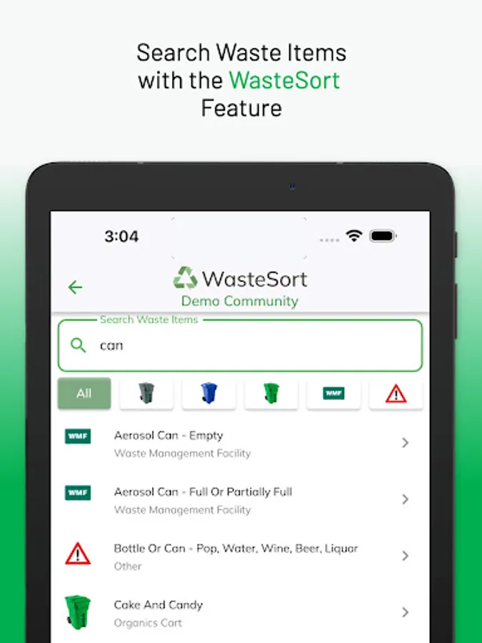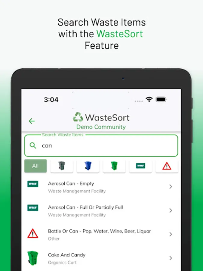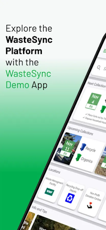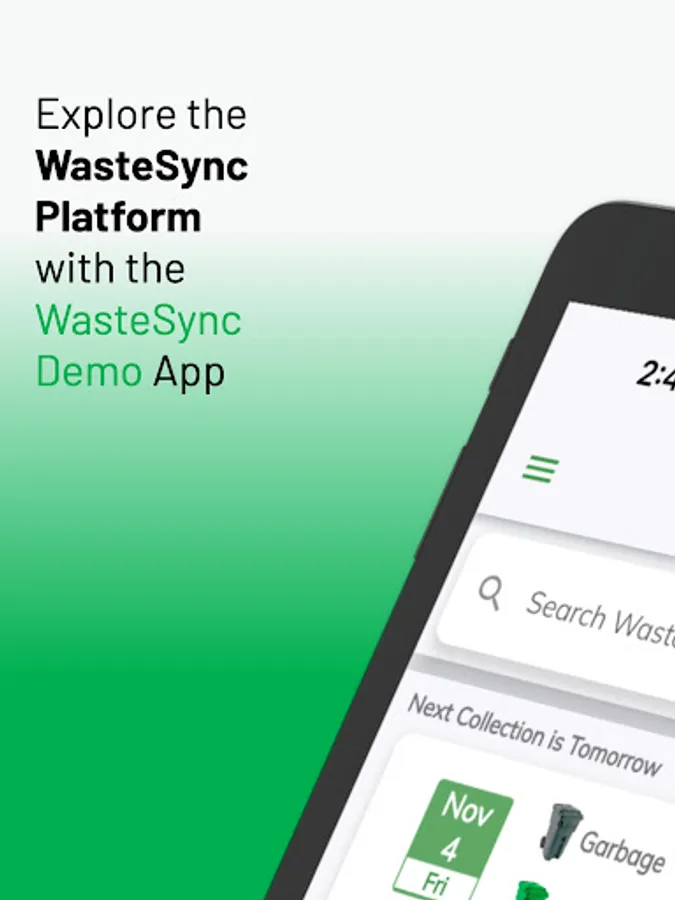 The WasteSync Demo app lets you try the features of the WasteSync Platform. WasteSync is a municipal tool that helps citizens manage their waste disposal by providing a Waste Collection Schedule, Waste Sorting tool and Waste Collection notifications. (Access web app via DEMO.WasteSync.ca on any device)