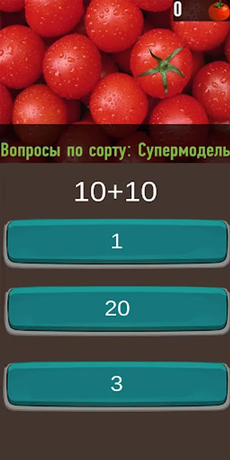 The application is a test game on knowledge about the care and technique of growing tomatoes for gardeners.