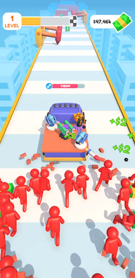 You drive a truck with mounted guns that you can merge to unlock new ones. Your goal is to survive and reach the finish line while avoiding enemy attacks and obstacles that can damage your truck. Can you make it to the end and become the ultimate Defence Runner?