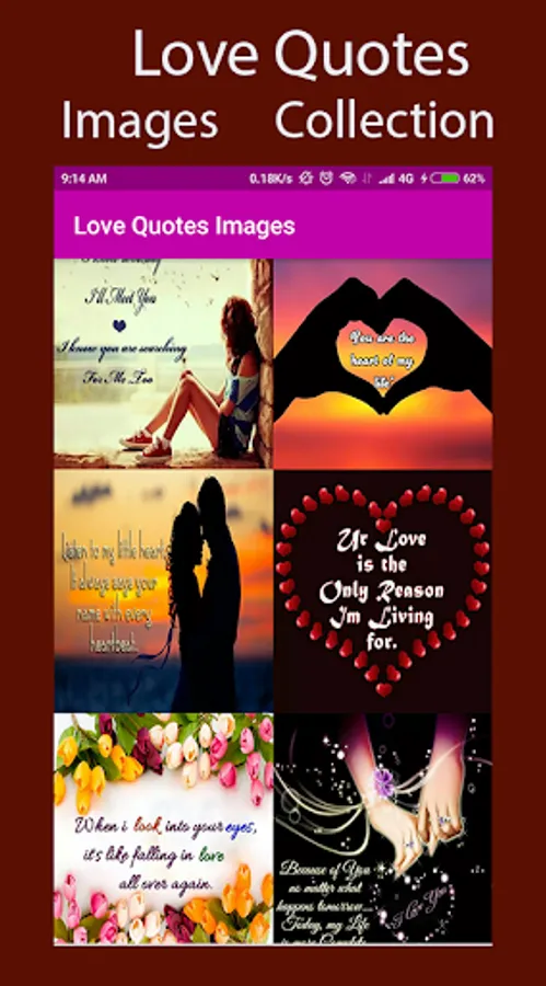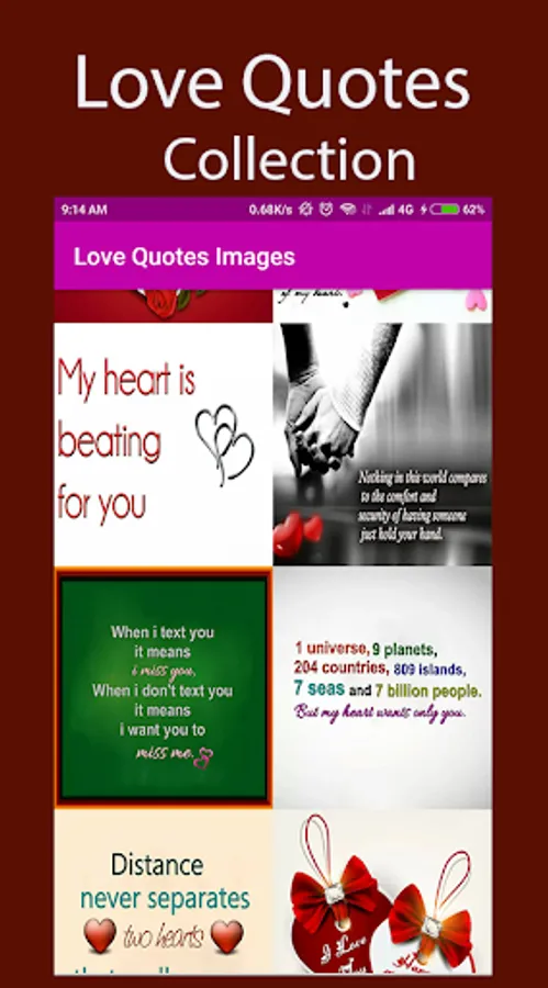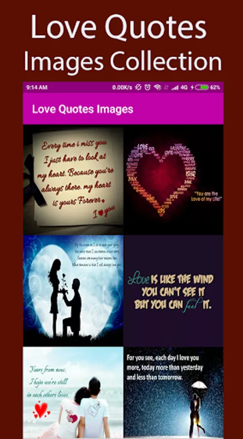Love Quotes Images Application is specially created with nice realistic and Beautiful Love Quotes background, it has a huge collection of Love wallpaper, Images, so wish your loved one, friends & family on this biggest love seasons with Romantic love images.