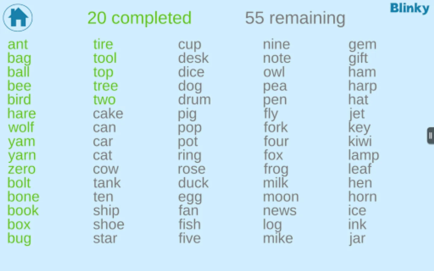 ant, bag, ball, bee, bird, bolt, bone, book, box, bug, cake, can, car, cat, cow,