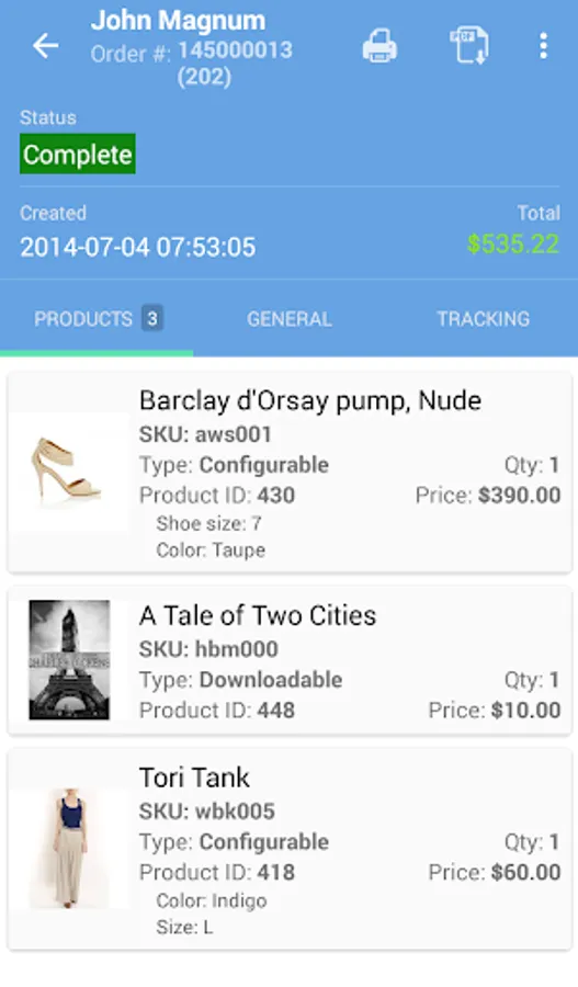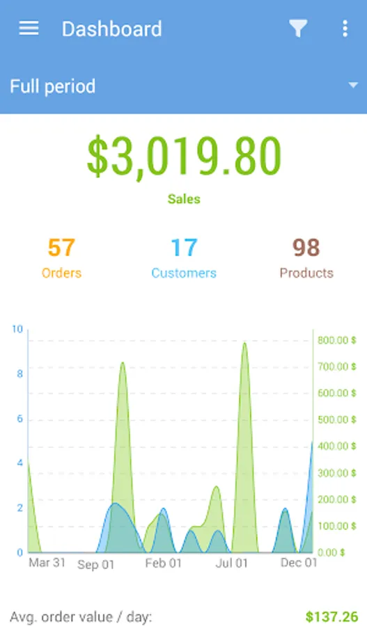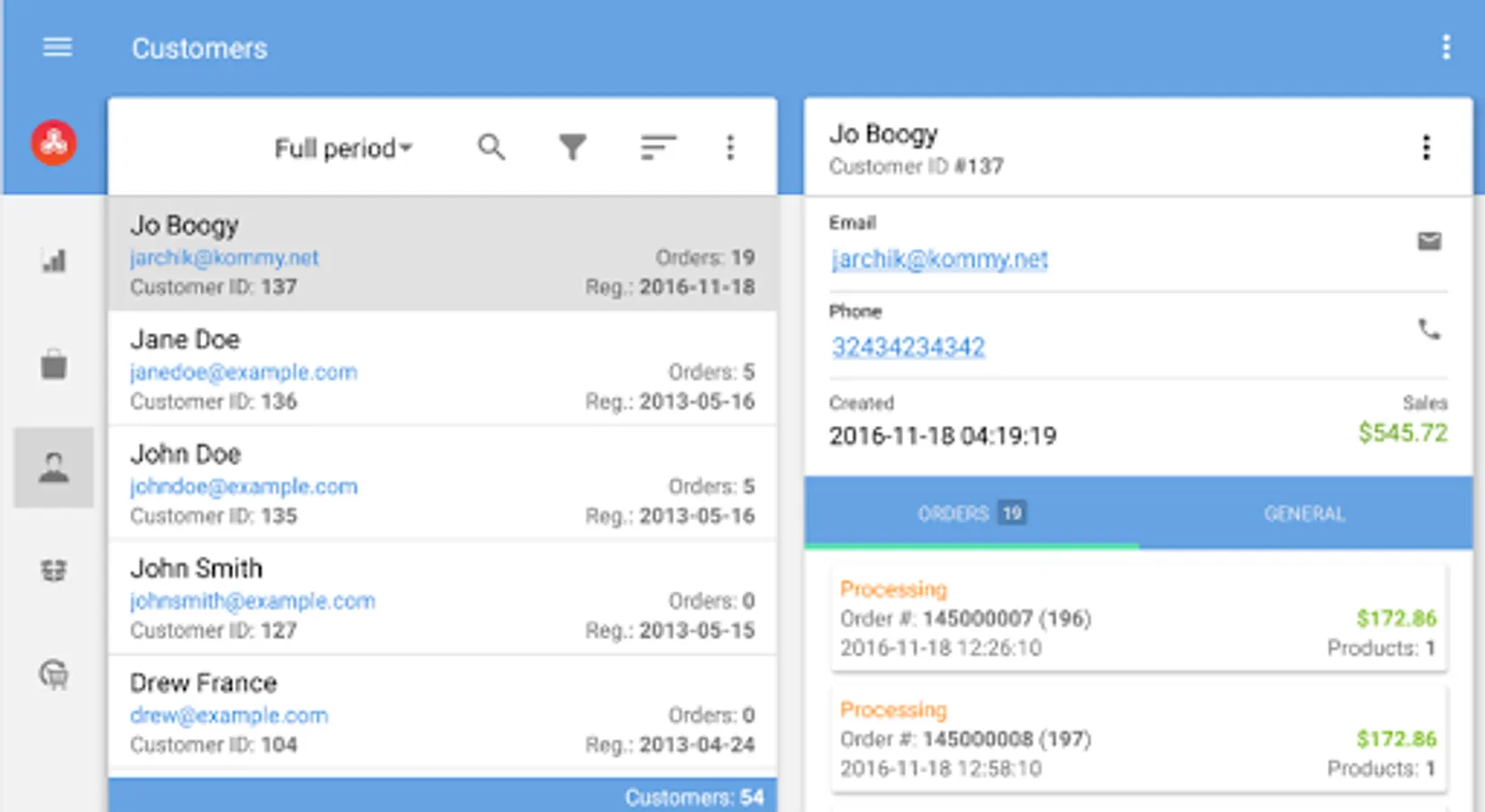 With Magento Mobile Assistant on you can be on the move and have access to the real-time store data reports at your fingertips. Using it you can monitor key details on your products, customers and orders from your Android device wherever you are.