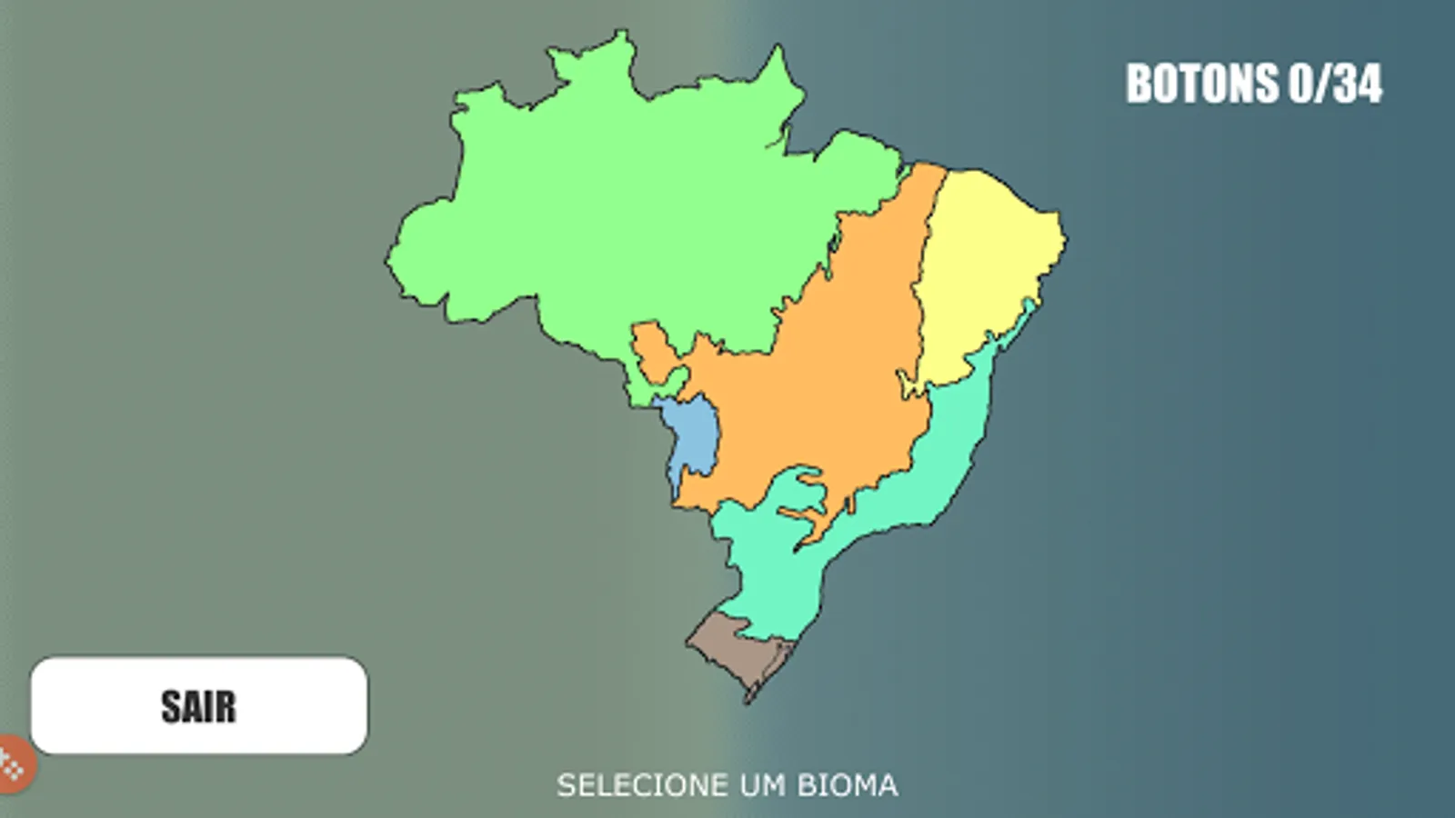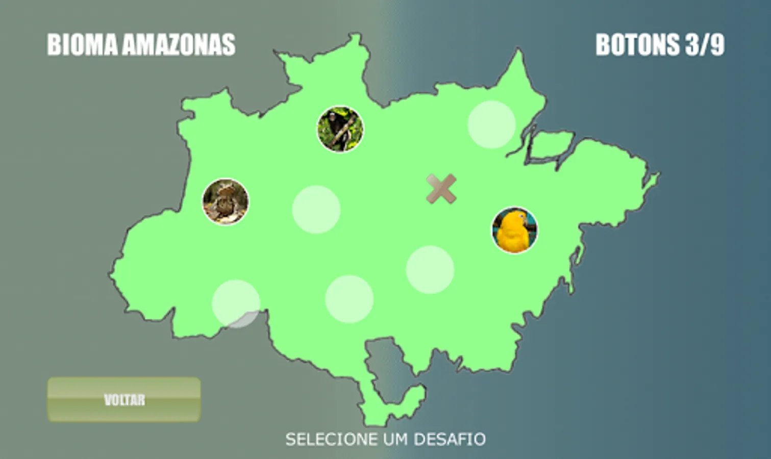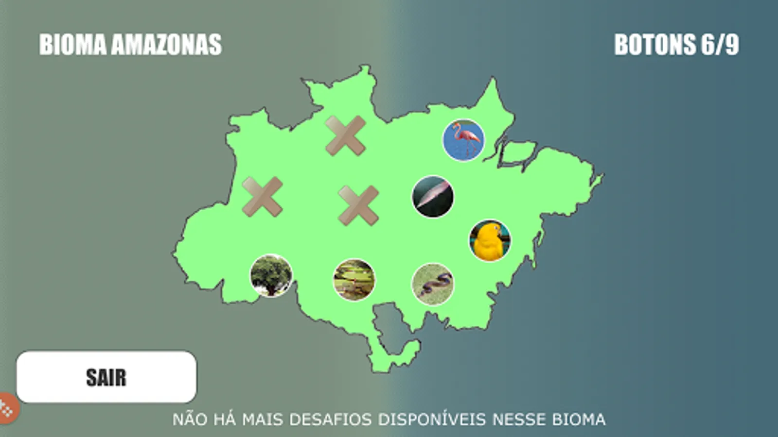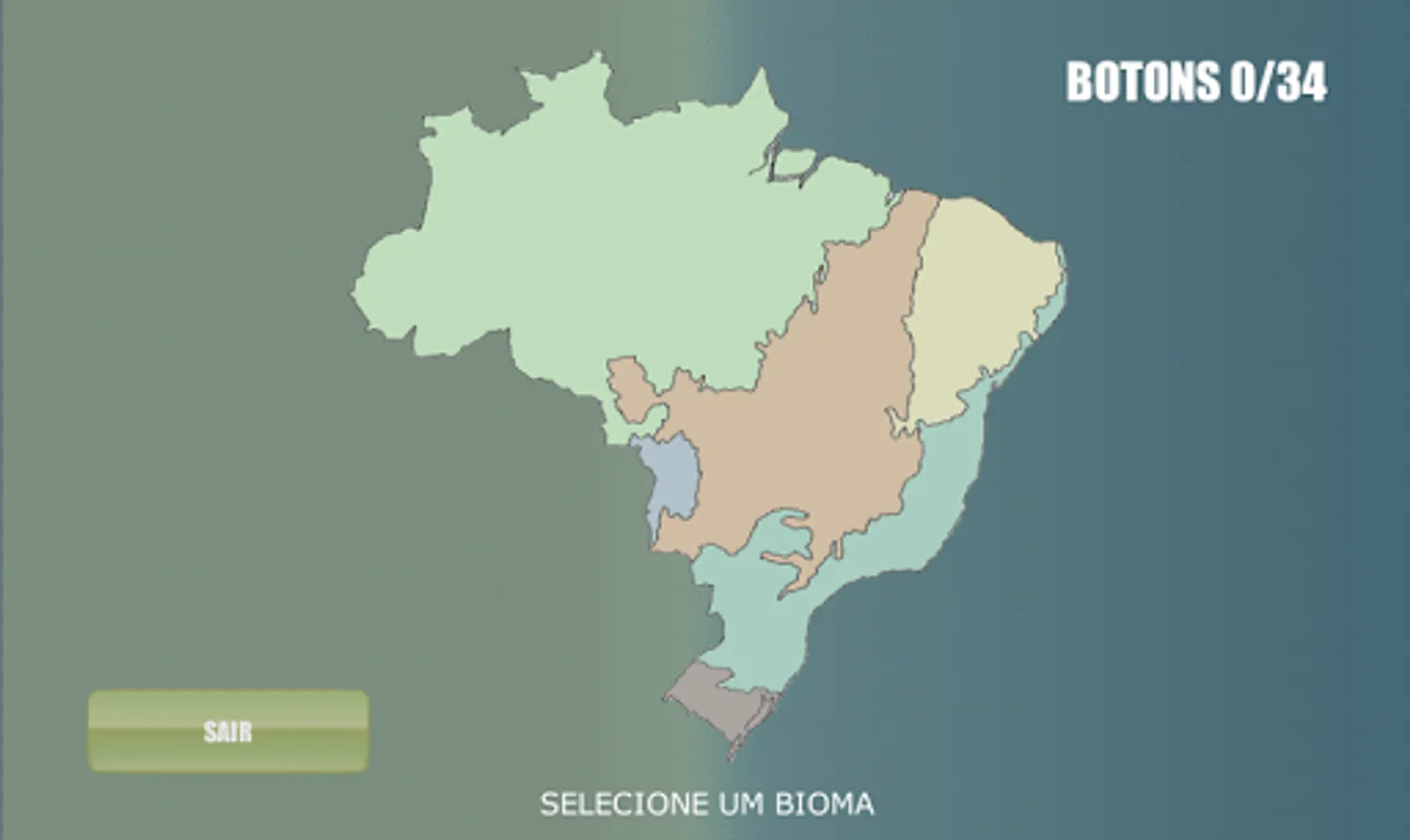 The Biodiversity game shows the map of Brazil divided into six biomes corresponding to the phases of the game. Each biome has circles, blanks, representing the loss of species of flora and fauna.